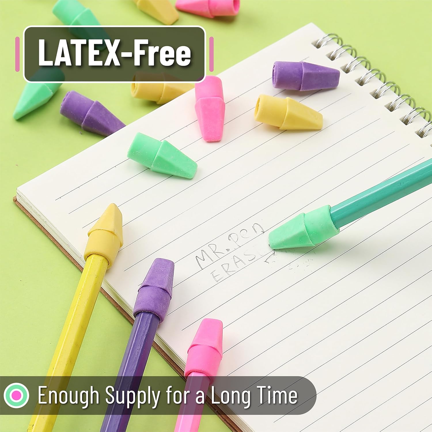 - Package includes 500 pencil top erasers in 4 assorted colors. They can also be the protective cap for pens or pencils, prevent tips from breaking, and make clean corrections to office documents and homework.