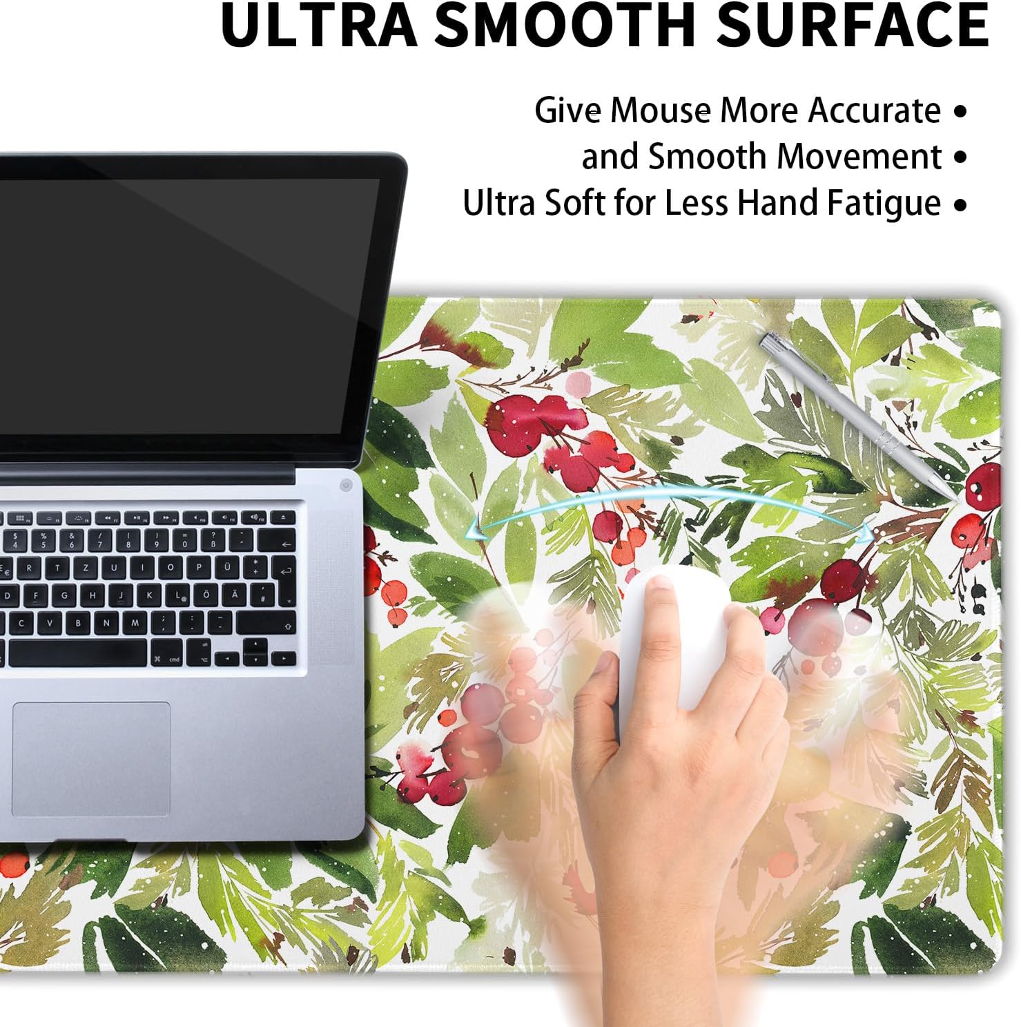 Watercolor Holly Christmas Gaming Mouse Pad XL Green Leaves Red Berry Xmas Extended Large Mat Mousepad Desk Pad Rubber Base Stitched Edge Winter Holiday Long Keyboard Pad for Computer,31.5×11.8 Inch