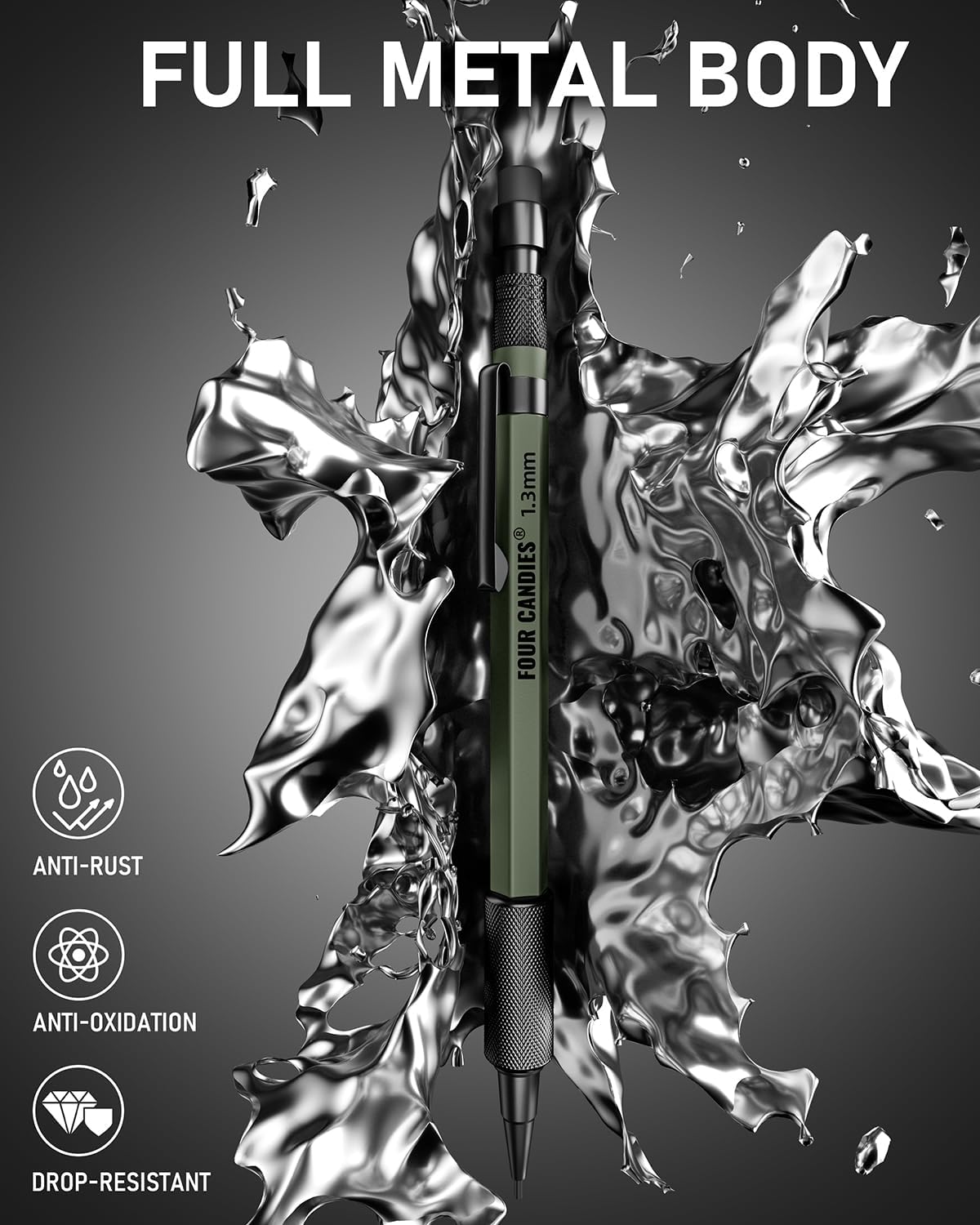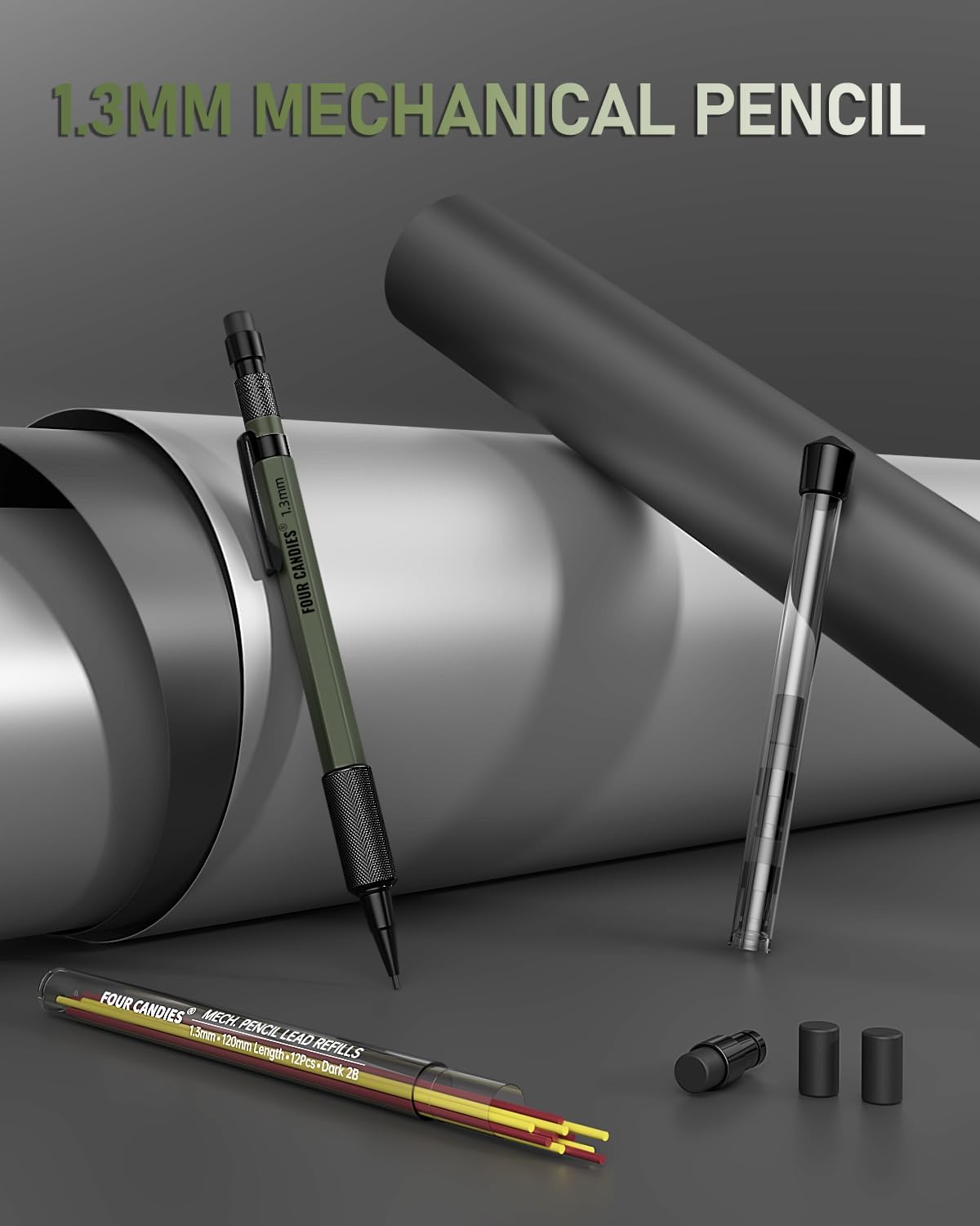 Four Candies 1.3mm Mechanical Pencil Set with 24 Lead Refills, Metal Weatherproof Heavy Duty Outdoor Carpenter Pencil, Eraser, 6 Eraser Refills for Architect Drafting Woodworking Marking with Case