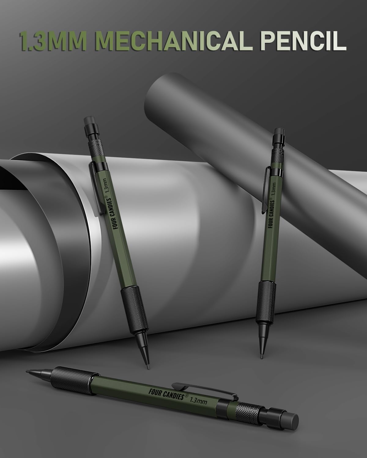 Four Candies 1.3mm Mechanical Pencil Set with 72 Lead Refill, 3PCS Metal Weatherproof Body Heavy Duty Carpenter Pencil, 3 Eraser, 16 Eraser Refill, for Outdoor Woodworking Drafting Marking with Case