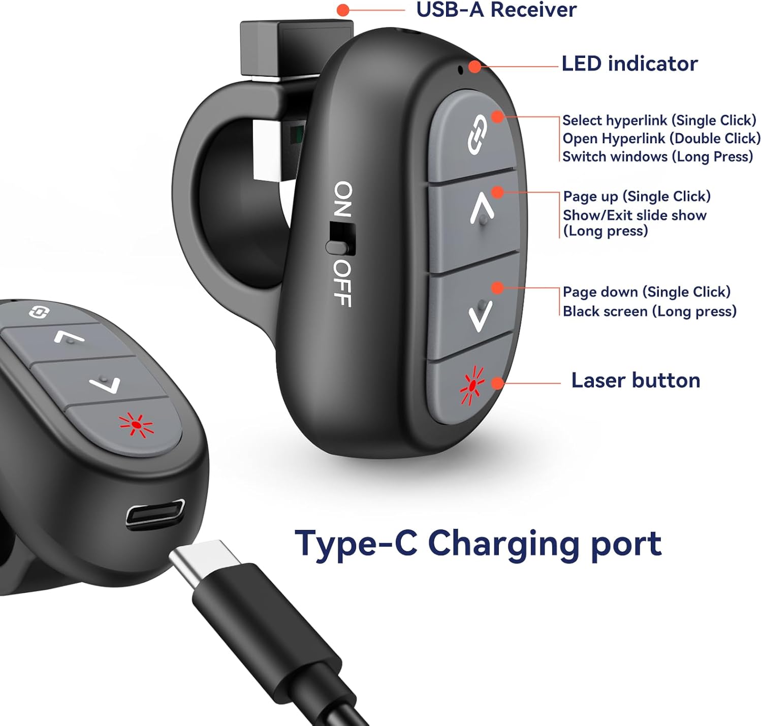 - Innovative Finger Ring Design: Stand out with a practical finger ring clicker. Keep your hands free, avoiding the trouble of misplacing your wireless presenter. The adjustable ring design ensures a comfortable fit for all finger sizes.