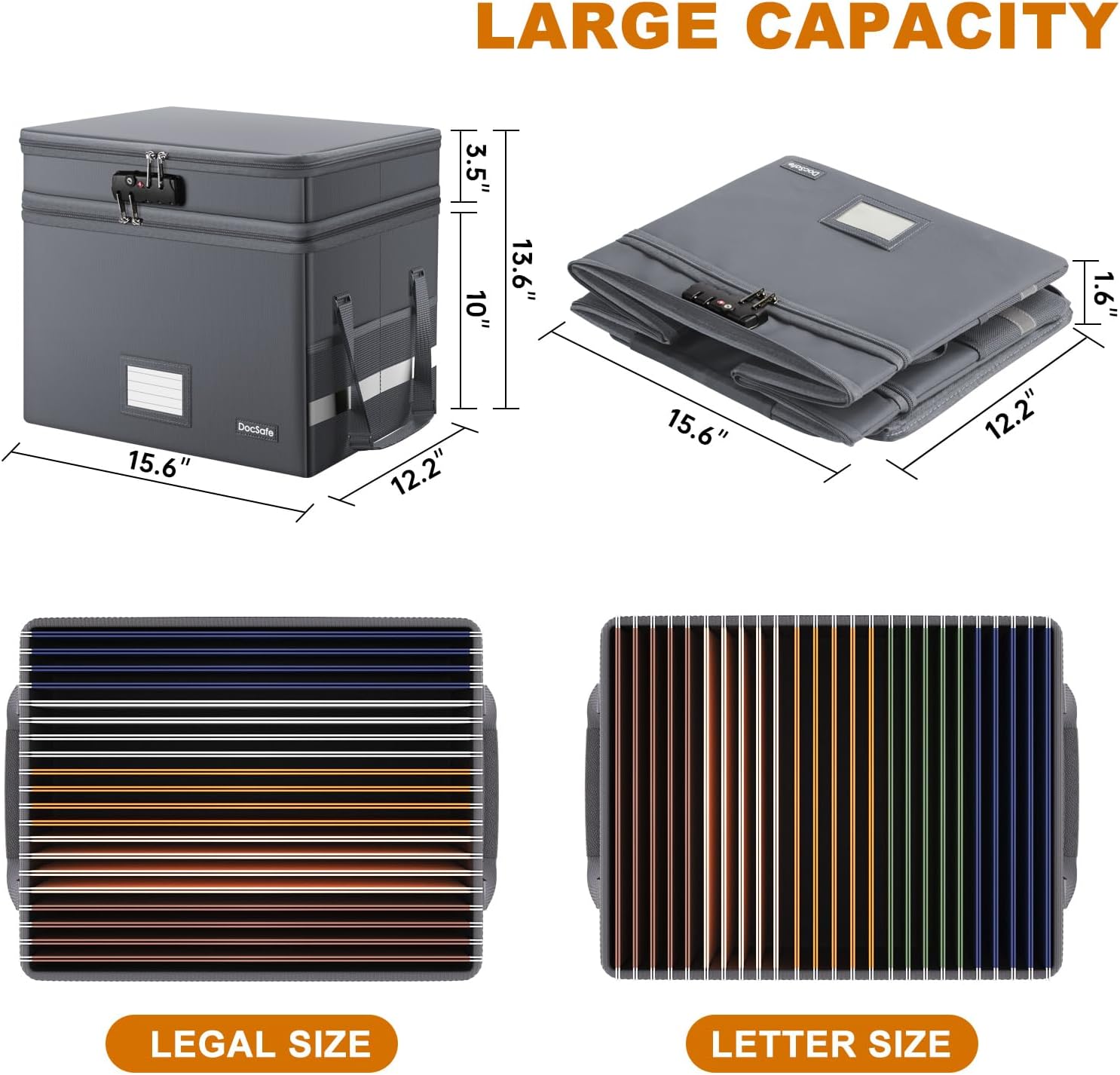 DocSafe File Box with Lock,Multi-Layer Fireproof Document Box Collapsible File Storage Organizer with Pockets/Handle,Large Portable Home Office Filing Box for Hanging Letter/Legal Size Folders,Gray