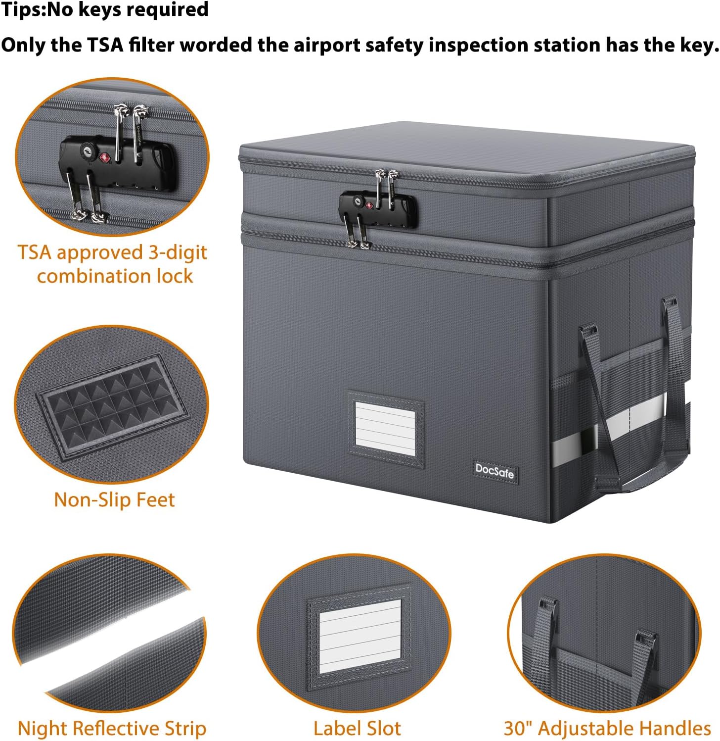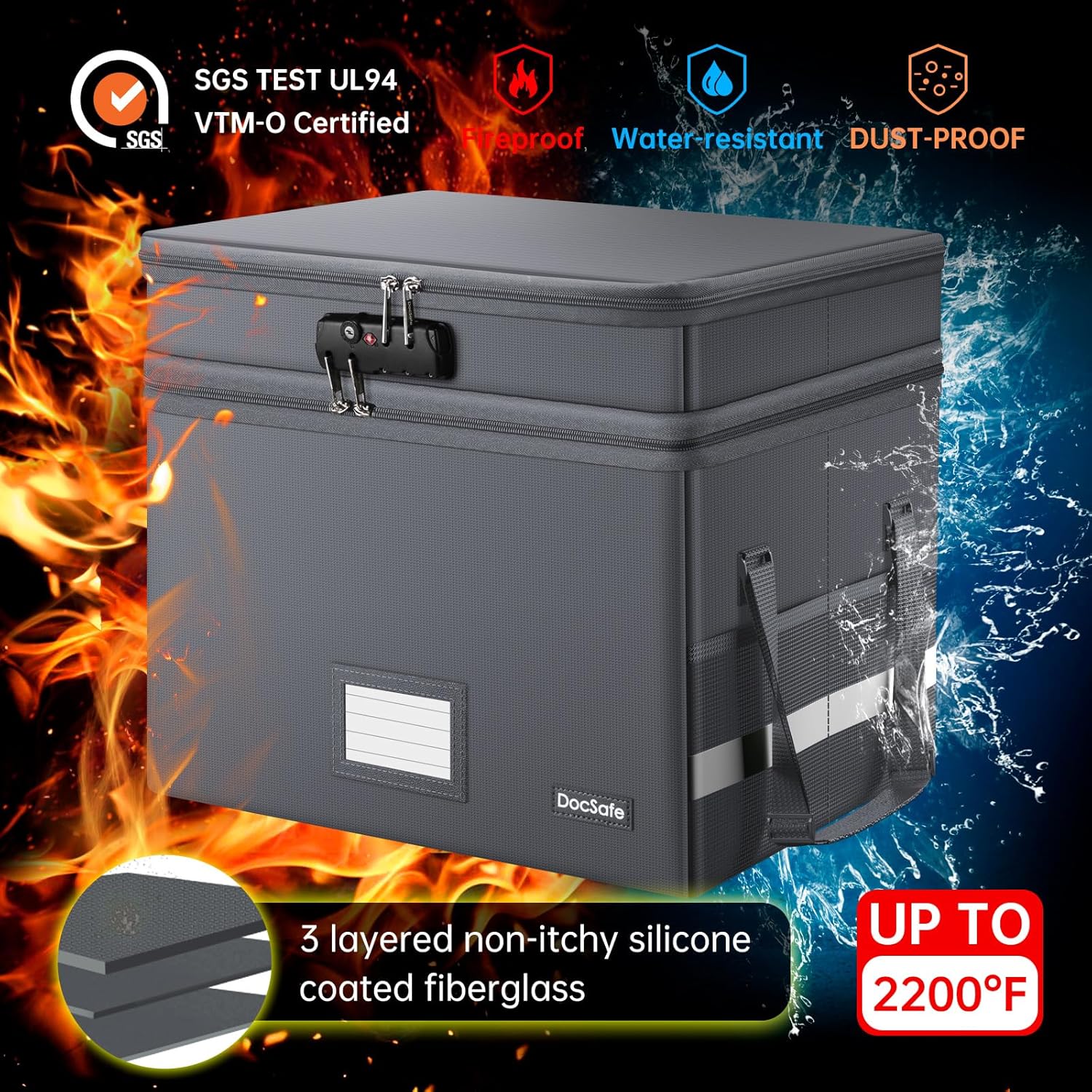 - Fireproof and Water-resistant: The multi-Layer rolling fireproof file box is made of 3 layered non-itchy silicone coated fiberglass which stands up the temperature up to 2200℉.It has been passed by SGS TEST(UL94 VTM-0 Certified).The file lock box is fireproof and waterproof, which can effectively protect your important documents in a fire, flood, and wet weather. They will further keep your files intact. Nothing is completely foolproof, but added protection is always a good idea.