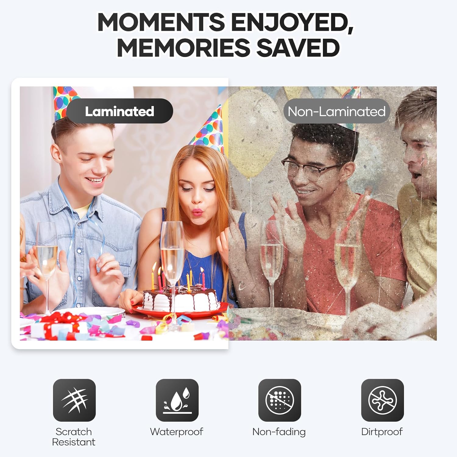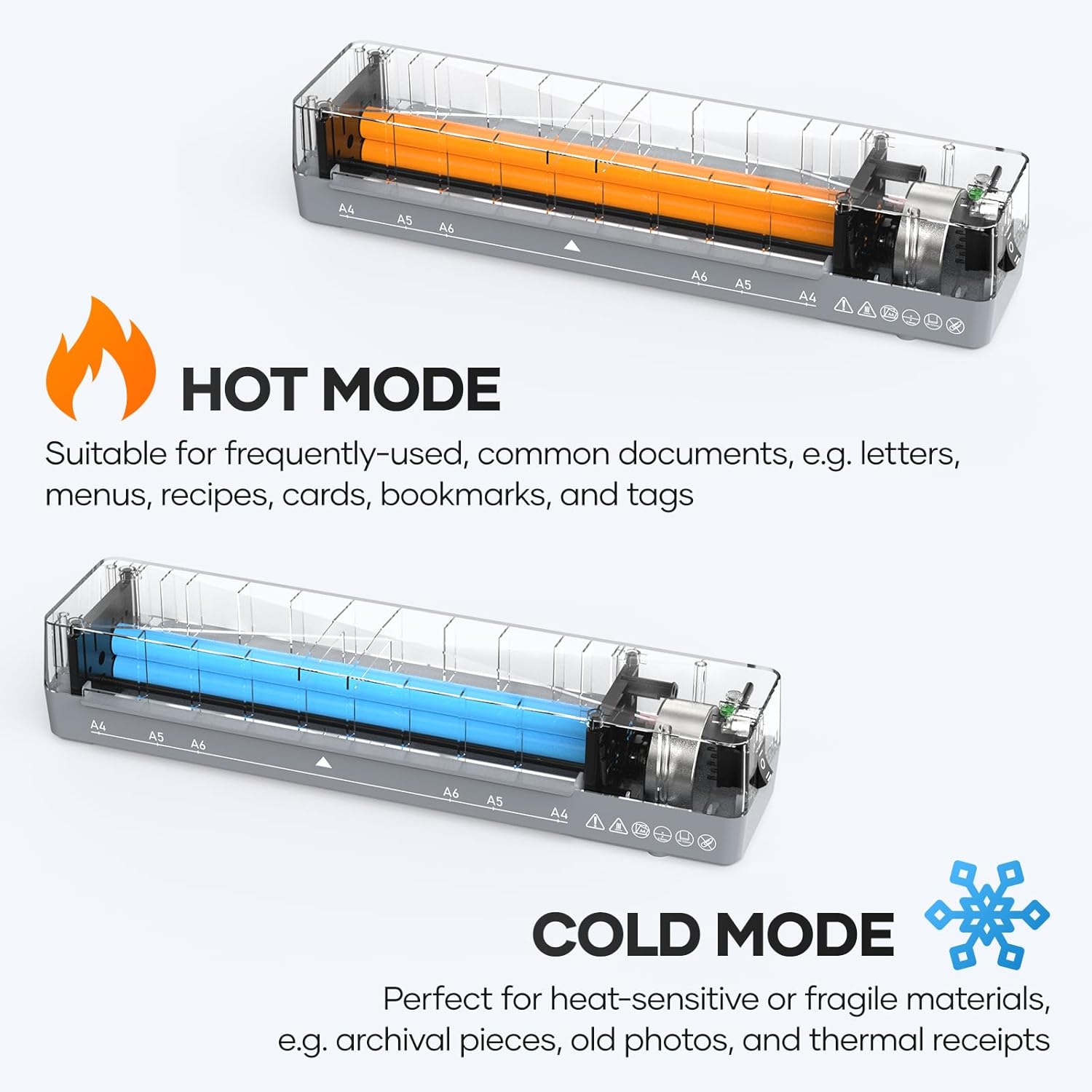 - 【Cold laminator】The cold mode is perfect for heat-sensitive materials such as stamps, invoices, and more. (Please note that the cold mode requires self-adhesive pouches, which are not included in the package)