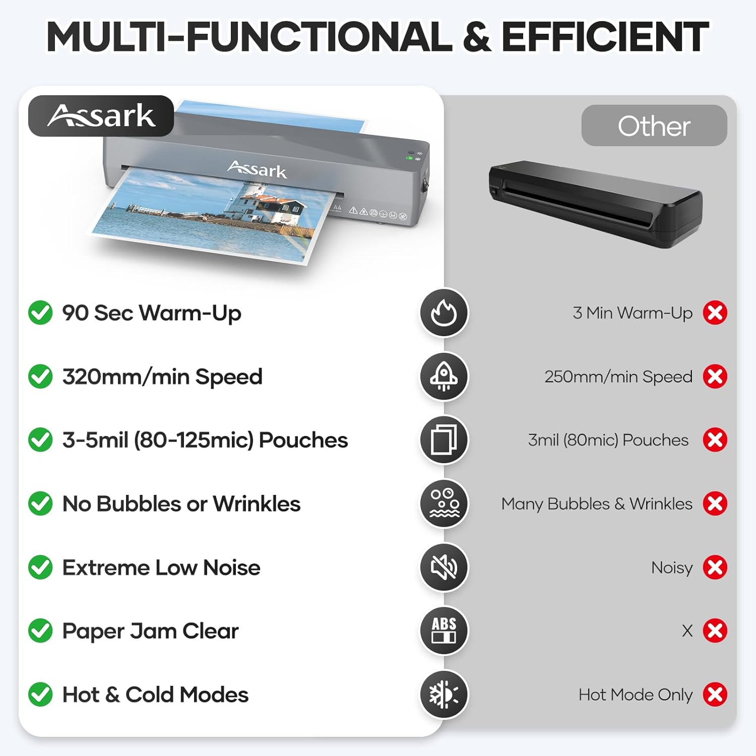 - 【Quick Warm-Up & Ultra-Quiet Operation】The Assark laminator machine a double-roller design that ensures smoother, and -low noise operation. It heats up quickly in just 90 seconds and laminates at a speed of 320mm/min