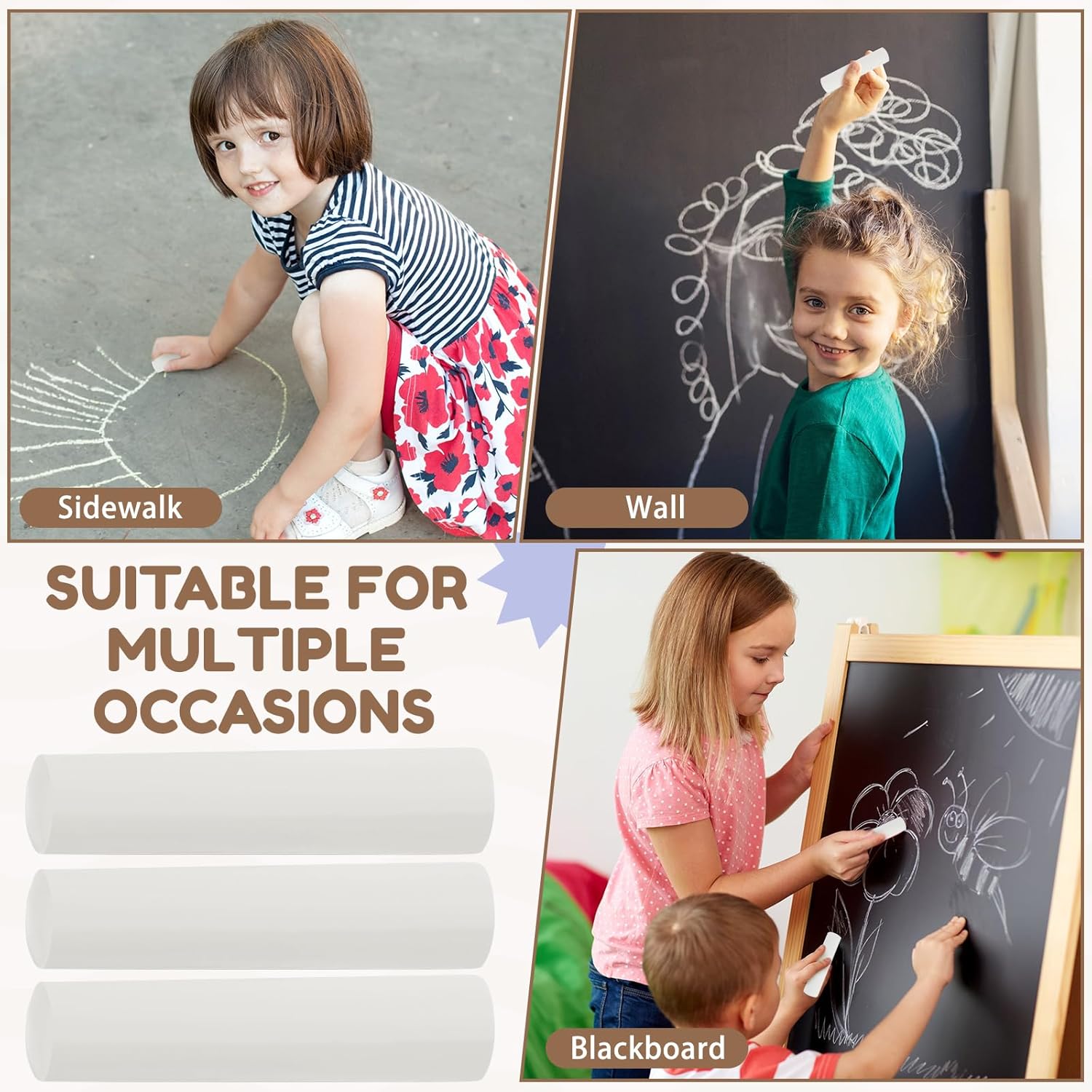 - Widely Applicable: you can use these kids sidewalk chalks on various occasions, for drawing, painting, etc., and you can use them to mark the buildings, to DIY, to decorate your wall, to make some crafts, which will bring you a lot of fun