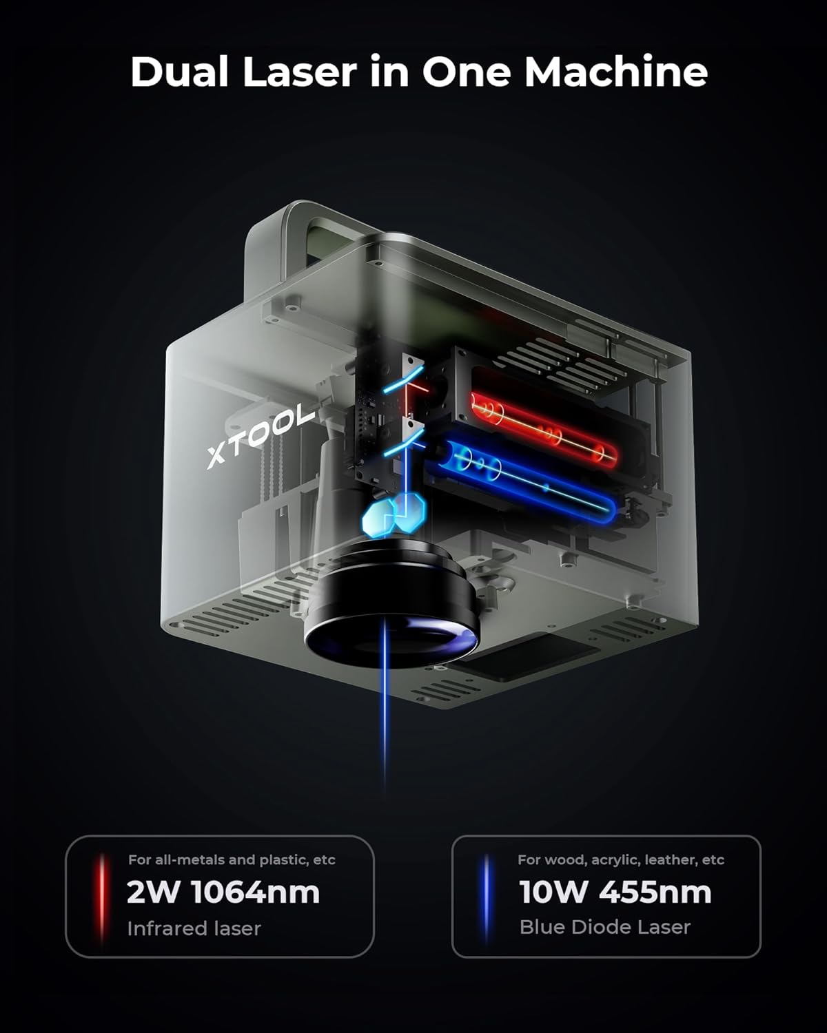 - Dual lasers fit 300+ Materials: The xTool F1 2-in-1 laser engraving machine is the world's first 2W(2000mW) infrared(for all metal materials) and 10W(10000mW) diode laser cutter and engraver machine(for wood, acrylic, etc). This laser engraver can cut 10mm wood and 6mm acrylic. Thus, this laser engraving machine allows you to customize business cards, wood blanks, dog tags, tumbler laser marking, and even do rust removal.