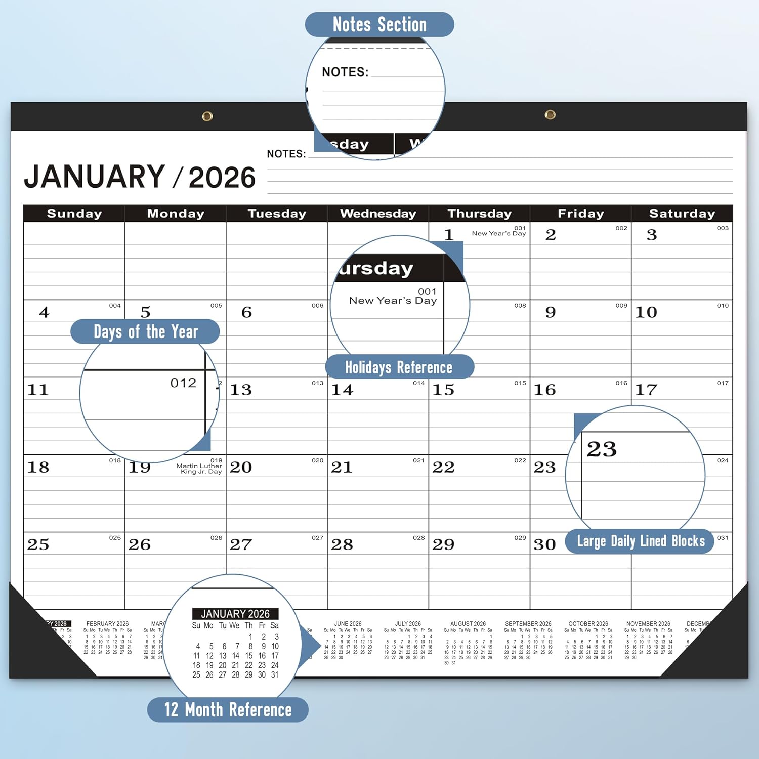 - 🎓CALENDARS--This desk calendar 2026 large 22x17 the first layer of PVC protective film can keep the desk calendar 2026 clean and prevent the calendar from being damaged by overturned water or coffee.Classroom calendar are easy-to-tear cutting lines can be easily torn off.With two black protective corners on the bottom to prevent the big calendar from being damaged.