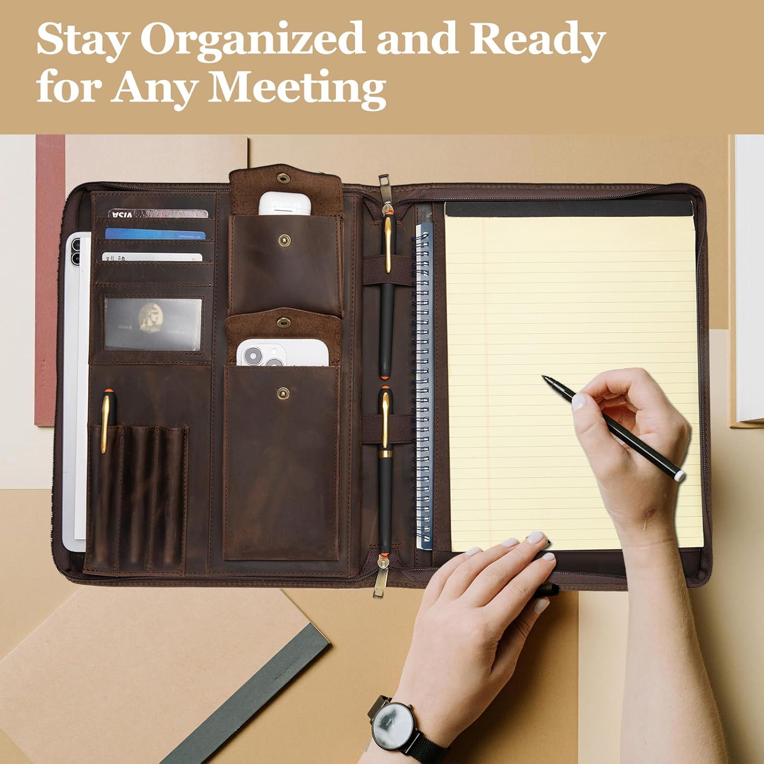 - Enhanced Storage and Convenience: Stay organized with our leather portfolio featuring a dedicated side pocket for tablets or notebooks. Easily access your phone in the specially crafted cell phone holder, and keep your earphones tangle-free in the integrated earbud holder. The portfolio includes an exterior pocket for quick access, a hidden handle for convenient carrying, and a secure dual YKK zipper enclosure to protect your essentials.