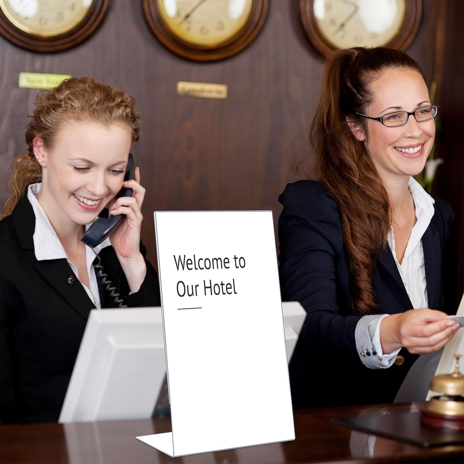 - Slant Back Design: the slant-back L-shaped design offers an optimal viewing angle that naturally draws attention while reducing glare; Whether placed on countertops or reception desks, it keeps your signage readable from every angle