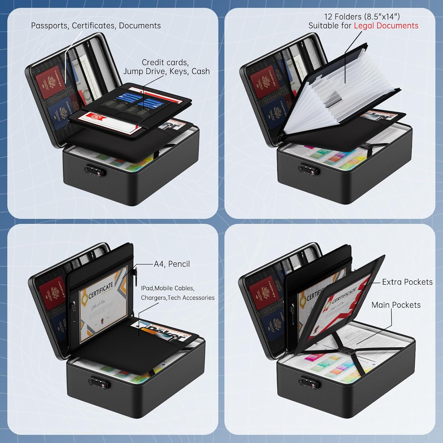 - 4-Layer Categorized Storage and Upgrade Size: Our 17"x 12"x 5.3" fireproof document bag has 4 levels of categorized storage space. Compare to other bag, we upgraded larger size, can hold more documents. 12 folder pages for document of legal document size and below. The internal compartment of the important document organizer is removable HOOK&LOOP design. Can store passports, legal documents, A4 papers, certificates, ID cards, credit cards, cash, chargers, electronic accessories, etc