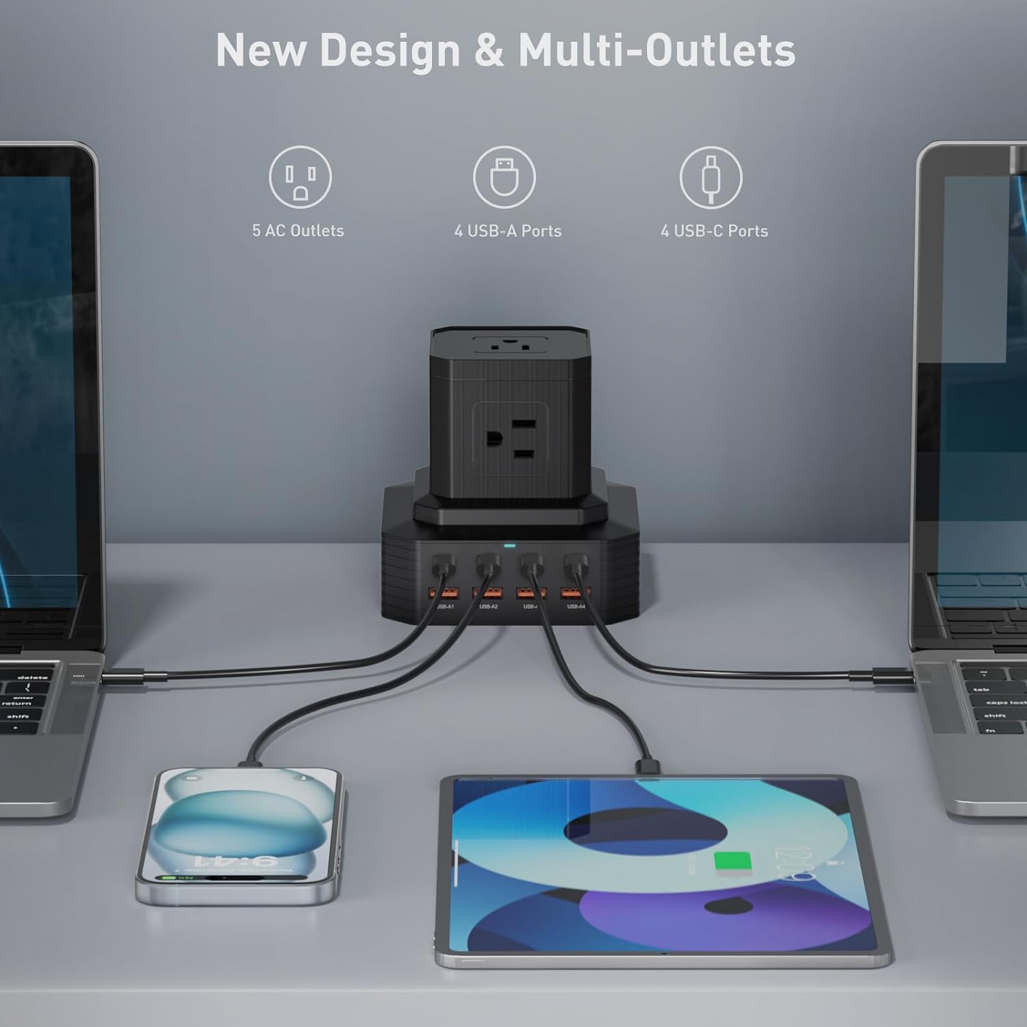 - 【13-in-1 All-in-One Power Solution】This revolutionary charging station consolidates 13 essential ports into a single compact hub: 4 USB-C ports, 4 USB-A ports, and 5 standard AC outlets. Perfect for home offices or dorm rooms, it powers your MacBook Pro, iPhone 15, iPad Pro, Galaxy Tab, wireless earbuds, and desk lamps simultaneously - no more tangled cables or hunting for spare outlets. The space-saving vertical design keeps your workspace pristine while delivering full-strength power to every connected device. Ideal for multi-device households and professionals juggling work-from-home setups, this charging station transforms chaotic desks into productivity zones overnight.