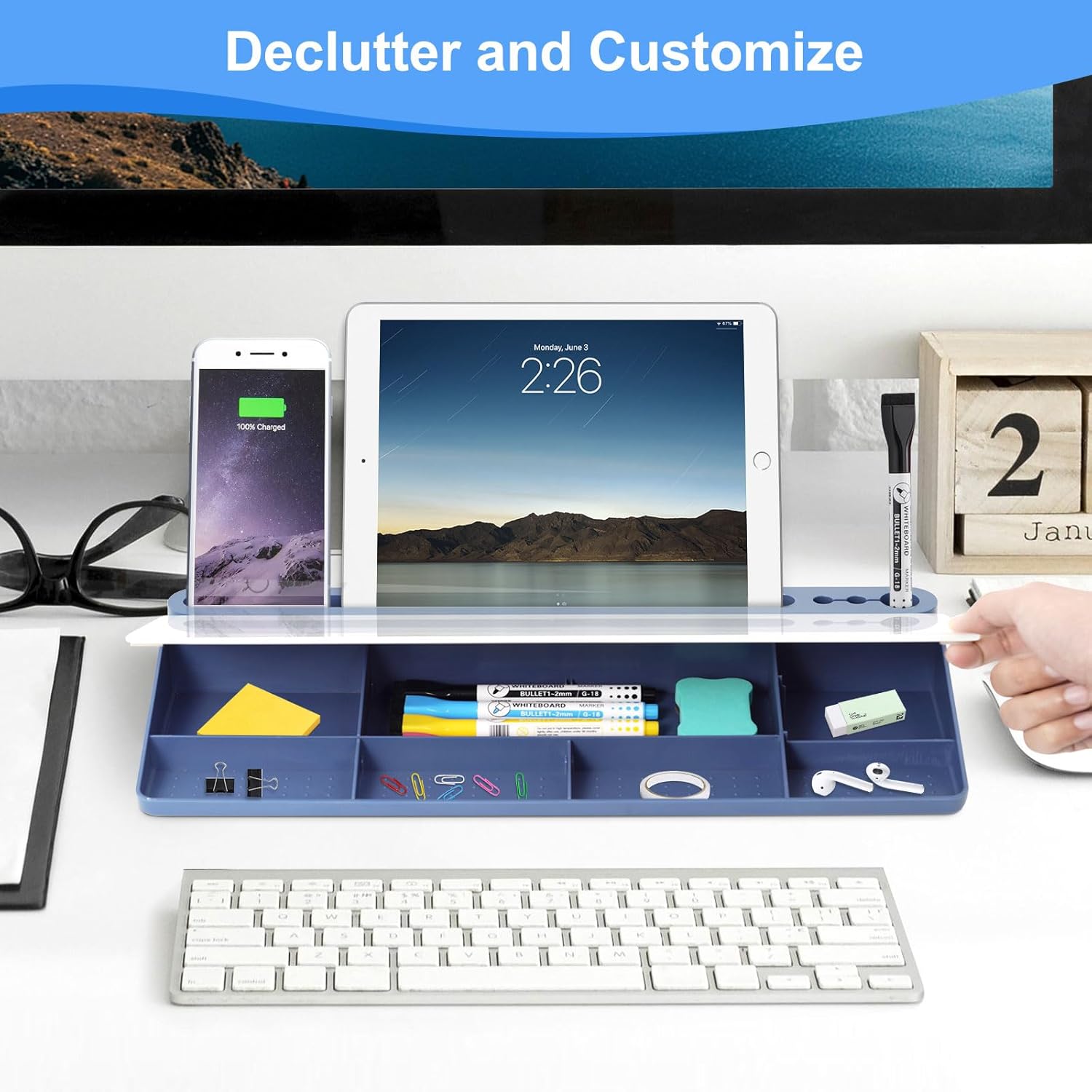 Glass Desktop Whiteboard with Storage, Desk White Board with Computer Keyboard Stand,White Dry Erase Board with Drawers for Home,School,Office - Blue