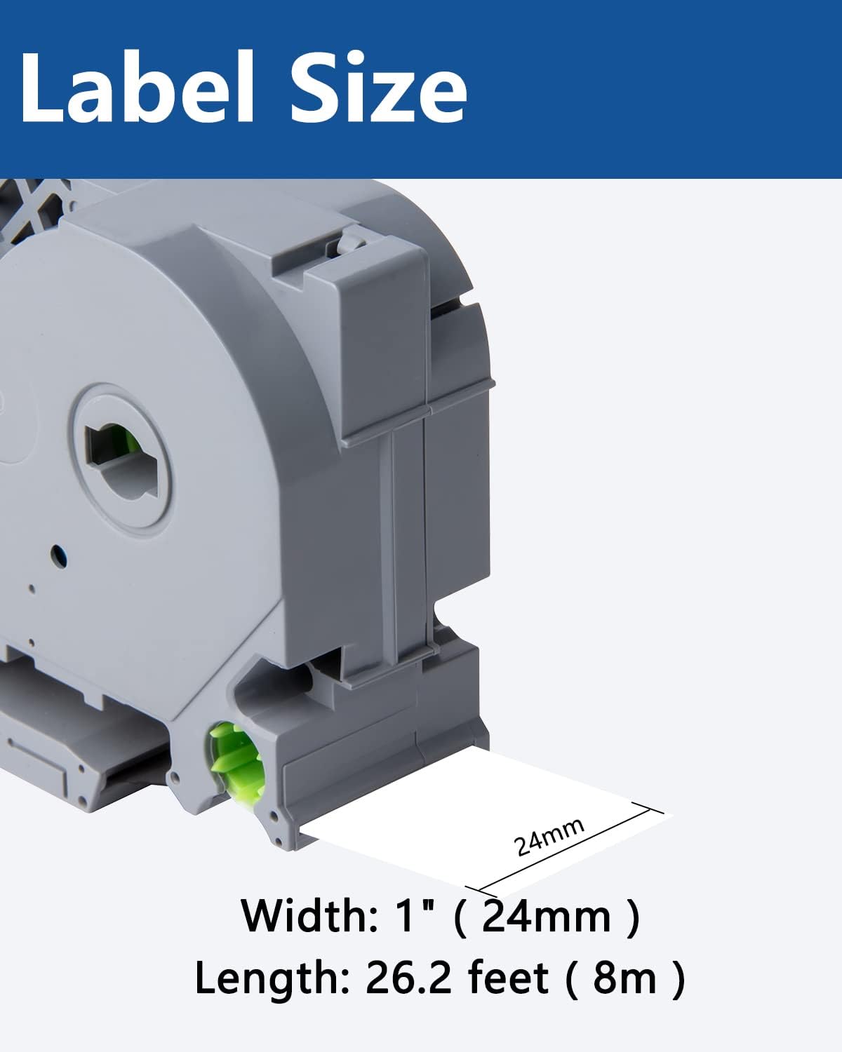 - Size - 0.94" width x 26.2' length ( 24mm x 8m ) each 24mm clear label maker tape. Color - Black ink on clear tape