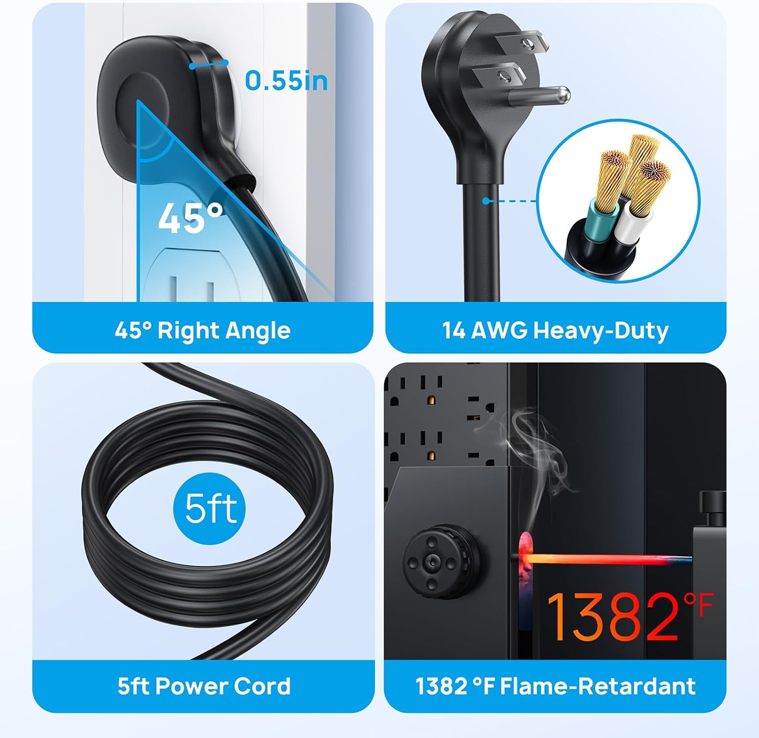 - 【Wall Mount and Flat Plug】Large power strip equipped with 4 screw holes in the corners, allows you to securely mount the surge protector box on the wall or under the desk. The 45° angle flat plug design is perfect for hiding behind furniture, bookshelves, and bedside tables in tight spaces