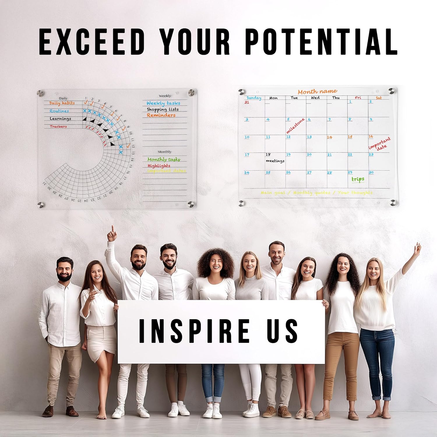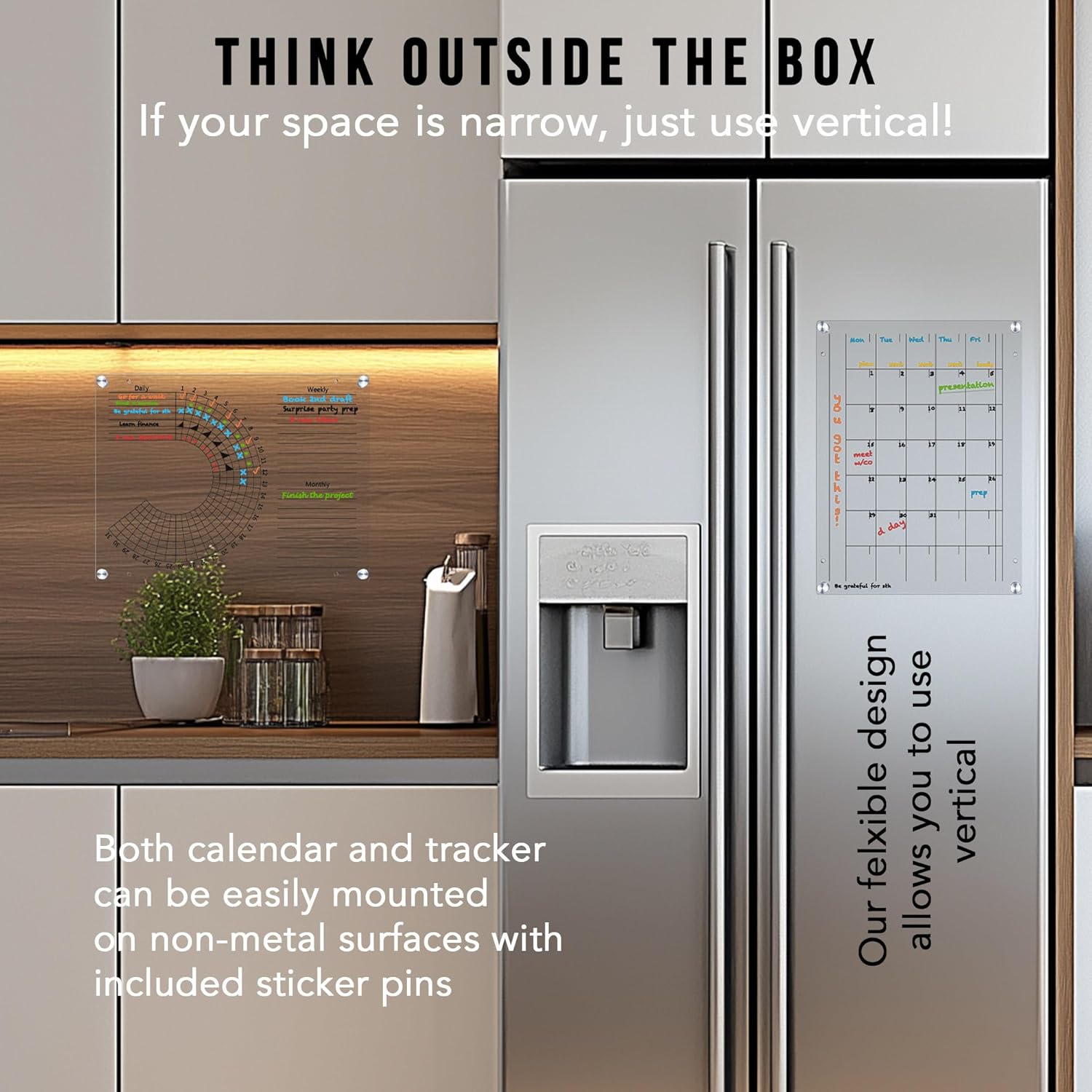 - All-in-one Set: Our Goal Tracker set consists of an acrylic habit tracker and an acrylic monthly calendar; a holistic approach for all-in-one solution for tracking and organizing your lives as a clear calendar for wall or a clear fridge calendar.