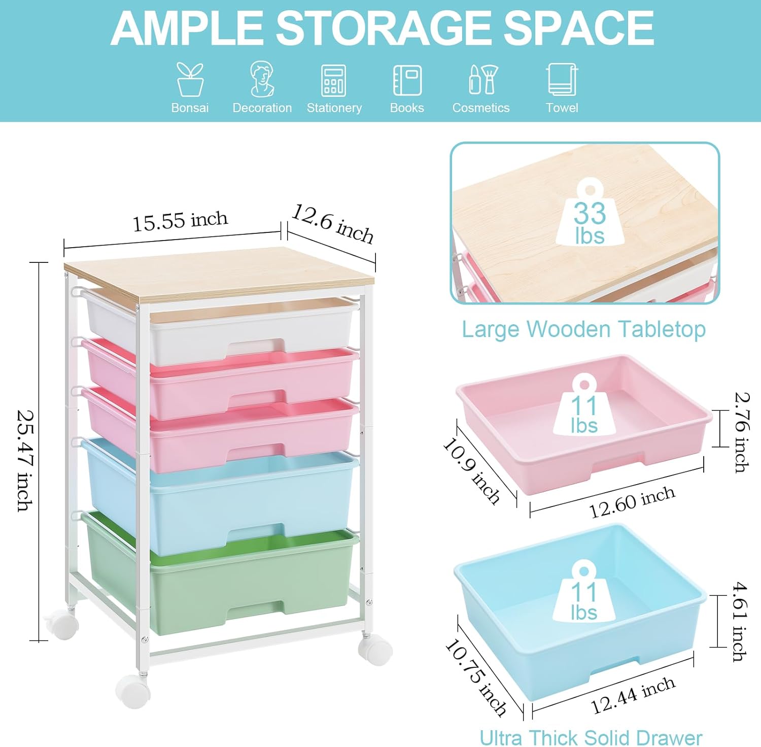 - AMPLE SPACE FOR STORAGE & CLASSIFICATION: The overall size of this rolling storage cart with drawers is 15.55"D x 12.60"W x 25.47"H.Wooden tabletable top allows you to put plants, DIY cutting machine,printer and other decorations.By expanding the storage space vertically, smart solution of making full use of limited space.There are different color drawers for to store and classifying your stuff.