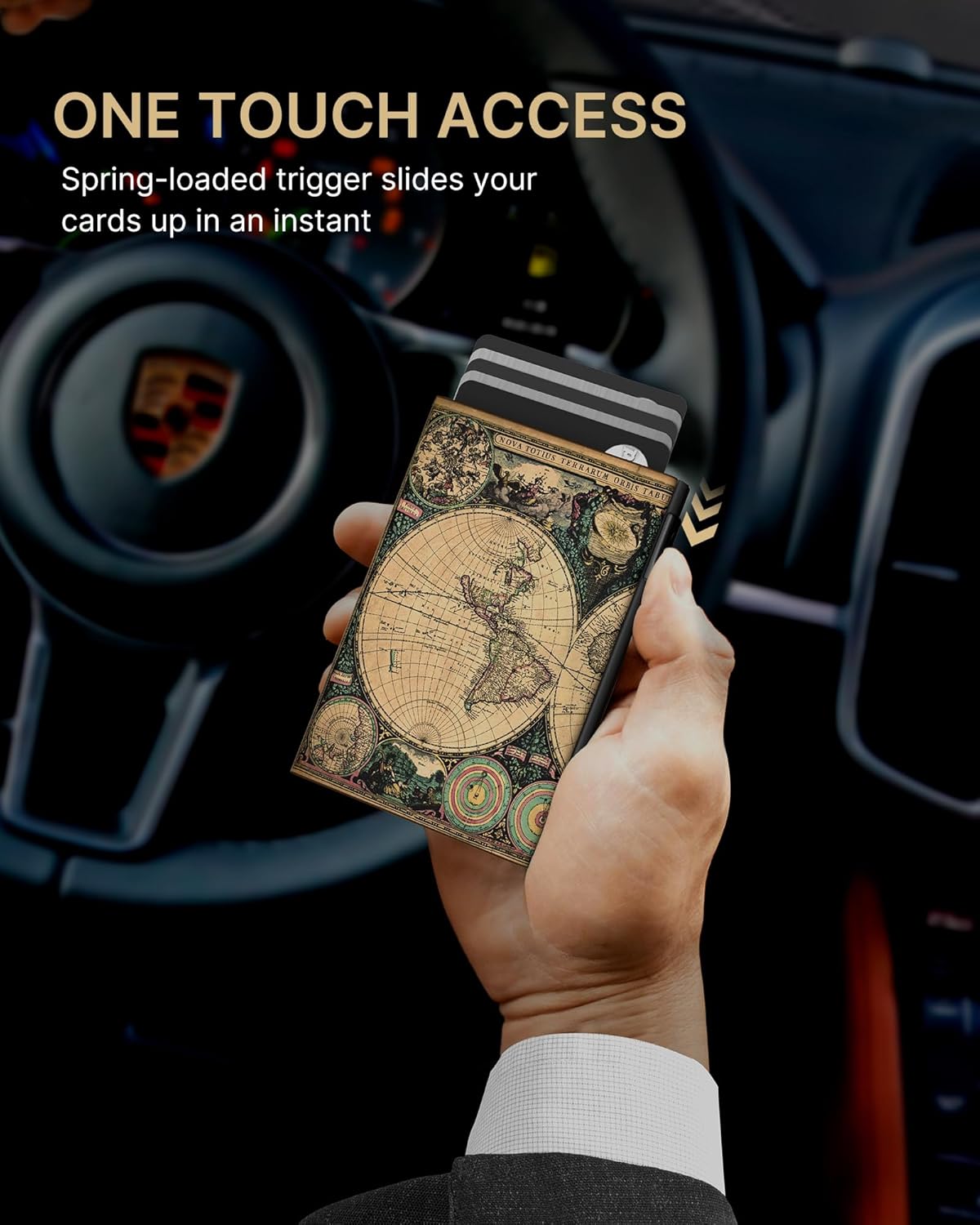 - 【QUICKEST ACCESS】Instant card access at the tap of a button by a single hand. Stores 10-15 cards and 15 bills total. The pop-up aluminum card holder stores 6-7, the built-in cash slot stores 50+ bills, and the ID window for driver's licenses.