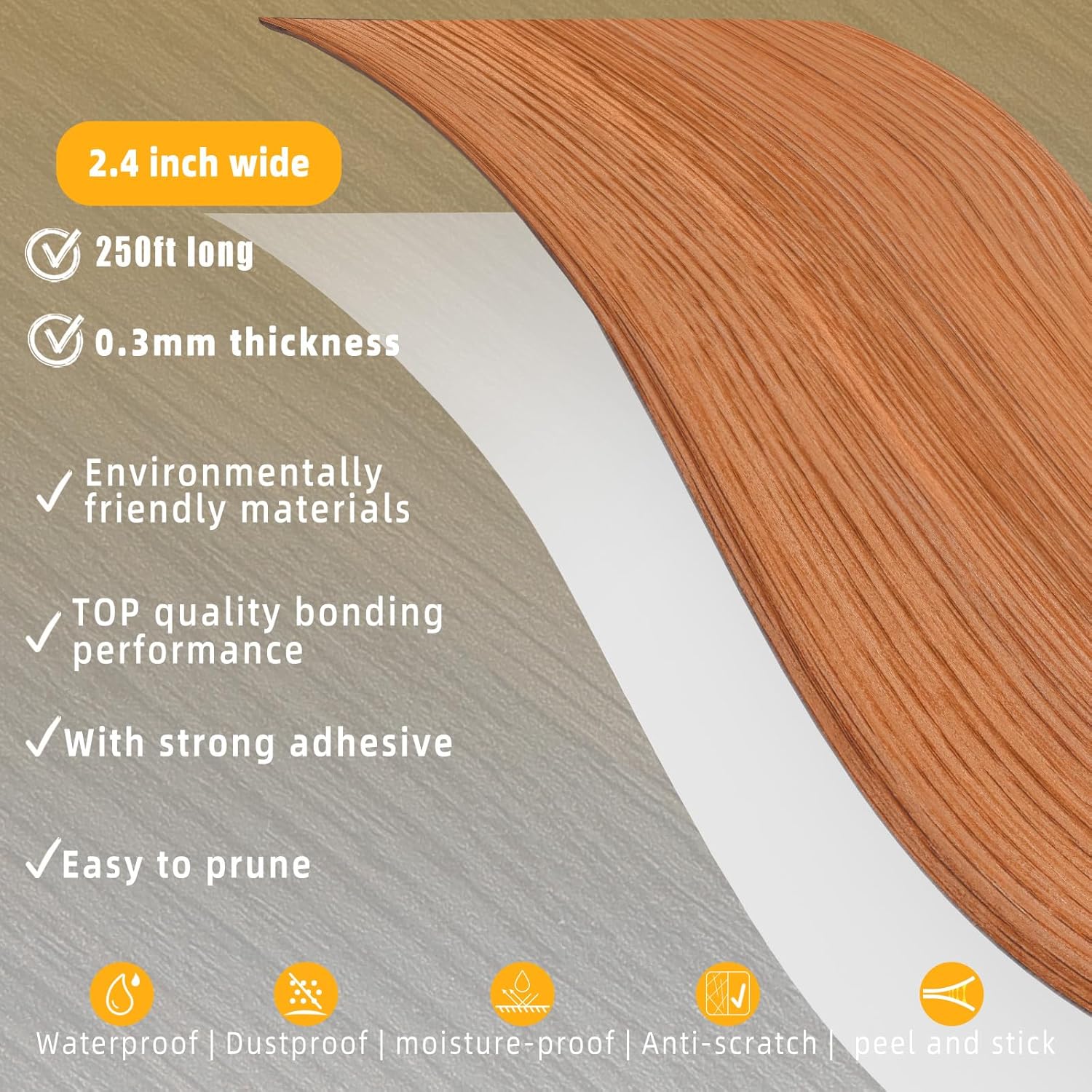 - Upgrade Design - The size of Wood Grain Repair Tape is 2.4 inch x 250ft, and the thickness is 0.3mm, It's suitable for your daily needs. Wood Grain Repair Tape is a strip of wood veneer with self adhesive pre-applied to the back. Just peel, Cut out the required length, stick and give it a pass with hand to push the adhesive, 0.3mm thickness can let you easy to do