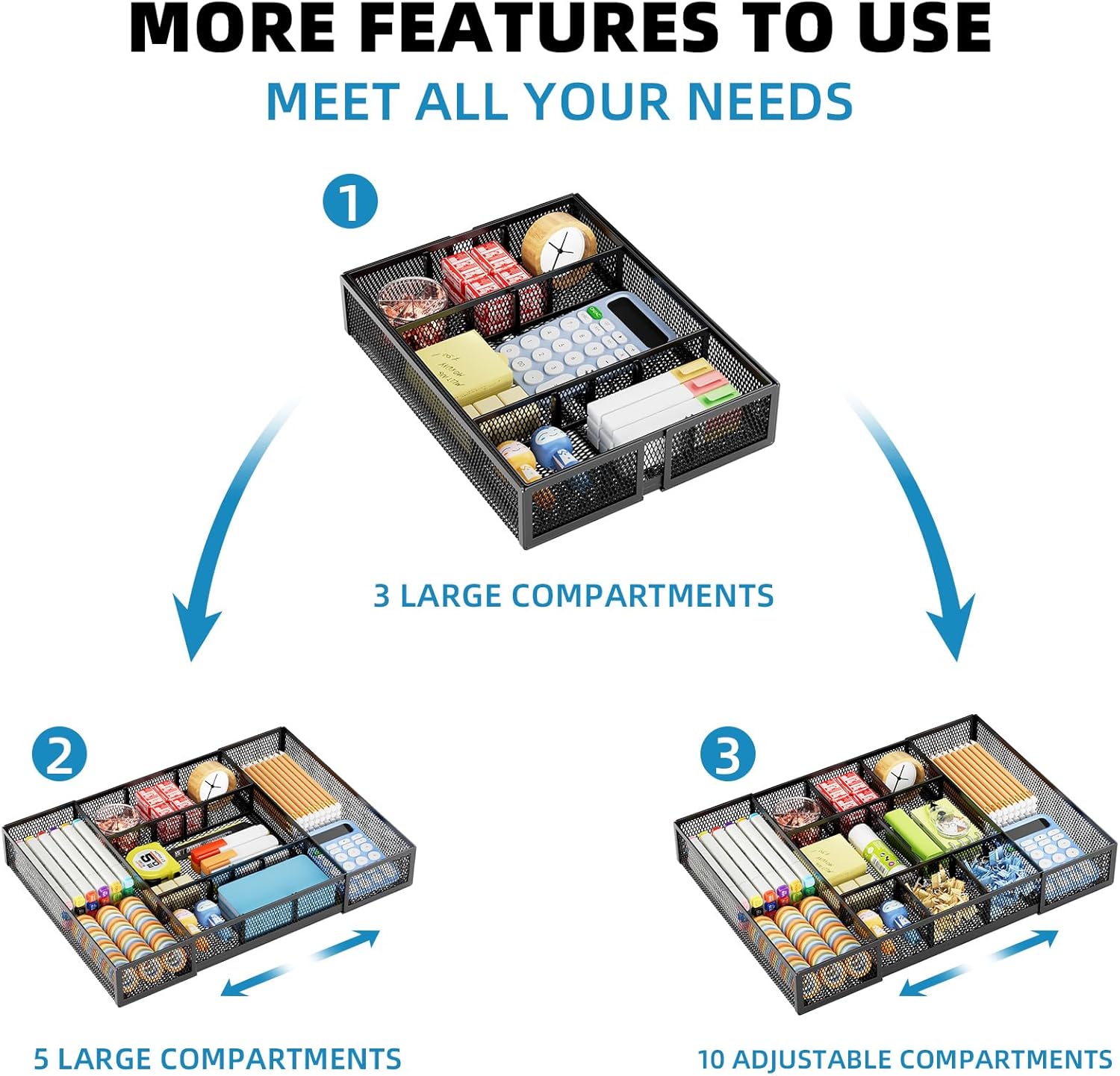Marbrasse Expandable Desk Drawer Organizer, Mesh Drawer Organizer Tray with 10 Adjustable Compartments, Desk Organizers and Accessories for Office Supplies, Makeup & Vanity (Expandable Black-2 pack)