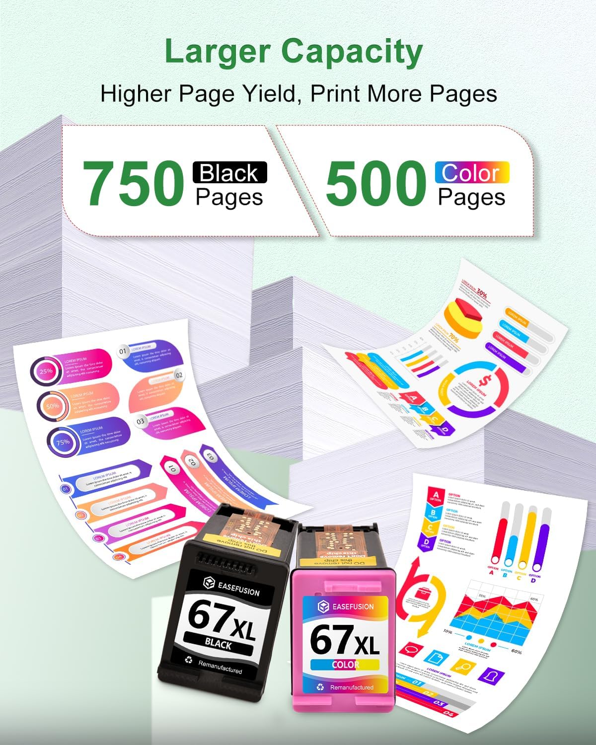 - Impressive Page Yield: With EaseFusion for 67xl hp printer ink, print more without compromising on quality. Deliver a high yield of 750 pages per replacement for hp 67xl black ink cartridge and 500 pages per for hp 67 color ink cartridge at 5% coverage on A4 paper. By choosing our replacement for hp 67xl ink cartridges black/color combo pack, just enjoy uninterrupted printing