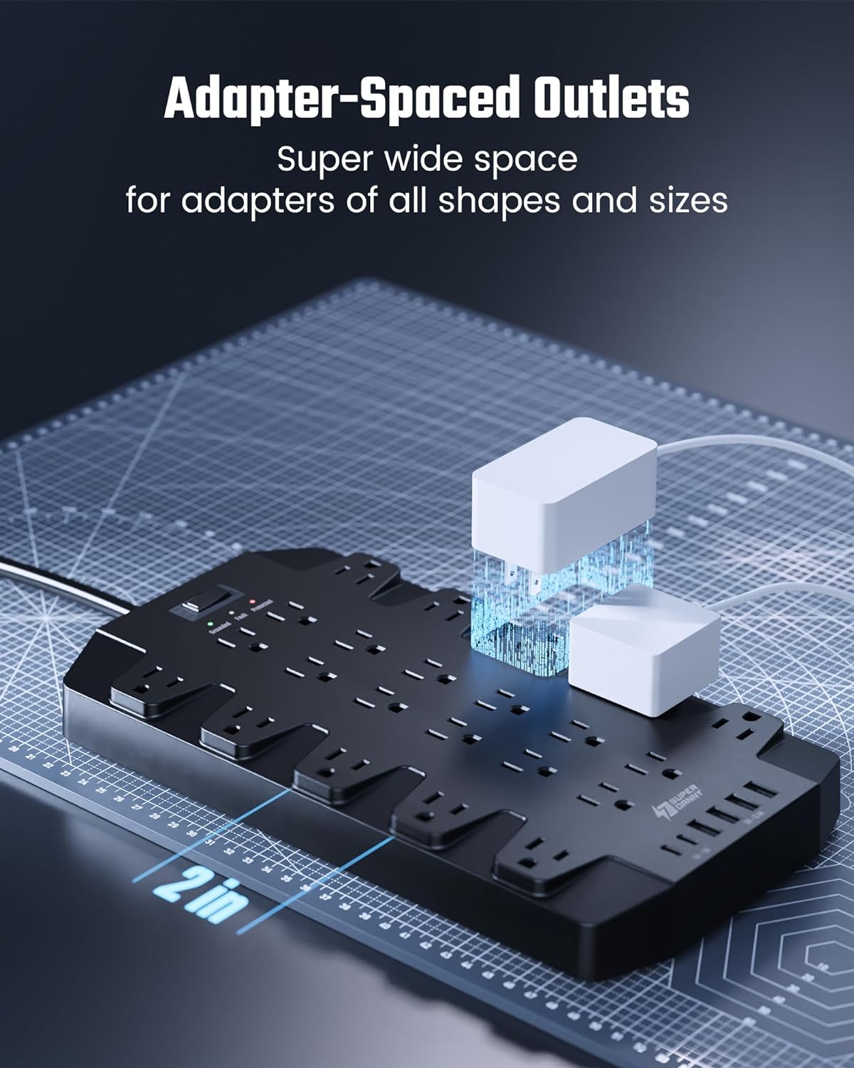 - 【2" Super Wide Outlets】Check our game-changing surge protector power strip with an impressive 2" extra-wide AC outlet spacing! SUPERDANNY outlet extender stands out with its wider socket spacing, perfect for accommodating bulky plugs and power adapters side by side, with none of them getting blocked. The four rows of outlets give you numerous ways of plugging in a variety of cords. No need for multiple power strips when one is enough!