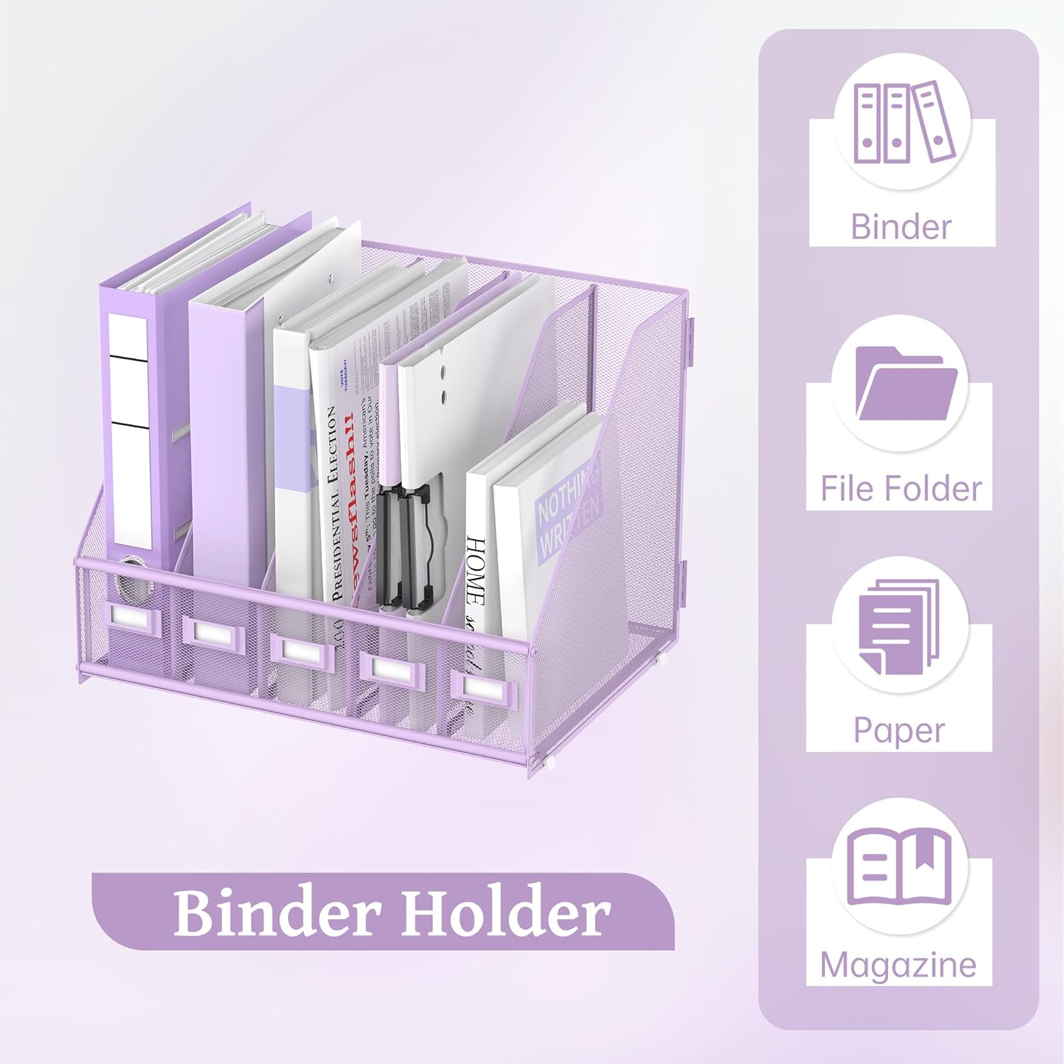 - [Humanized Detail Design] The file holder for desk has 5 vertical compartments, which is convenient for classifying office supplies. Replaceable tags are a great help for labeling, classifying, and quickly finding the desired item. Anti-skidding foot make the binder organizer difficult to slide on the desktop.