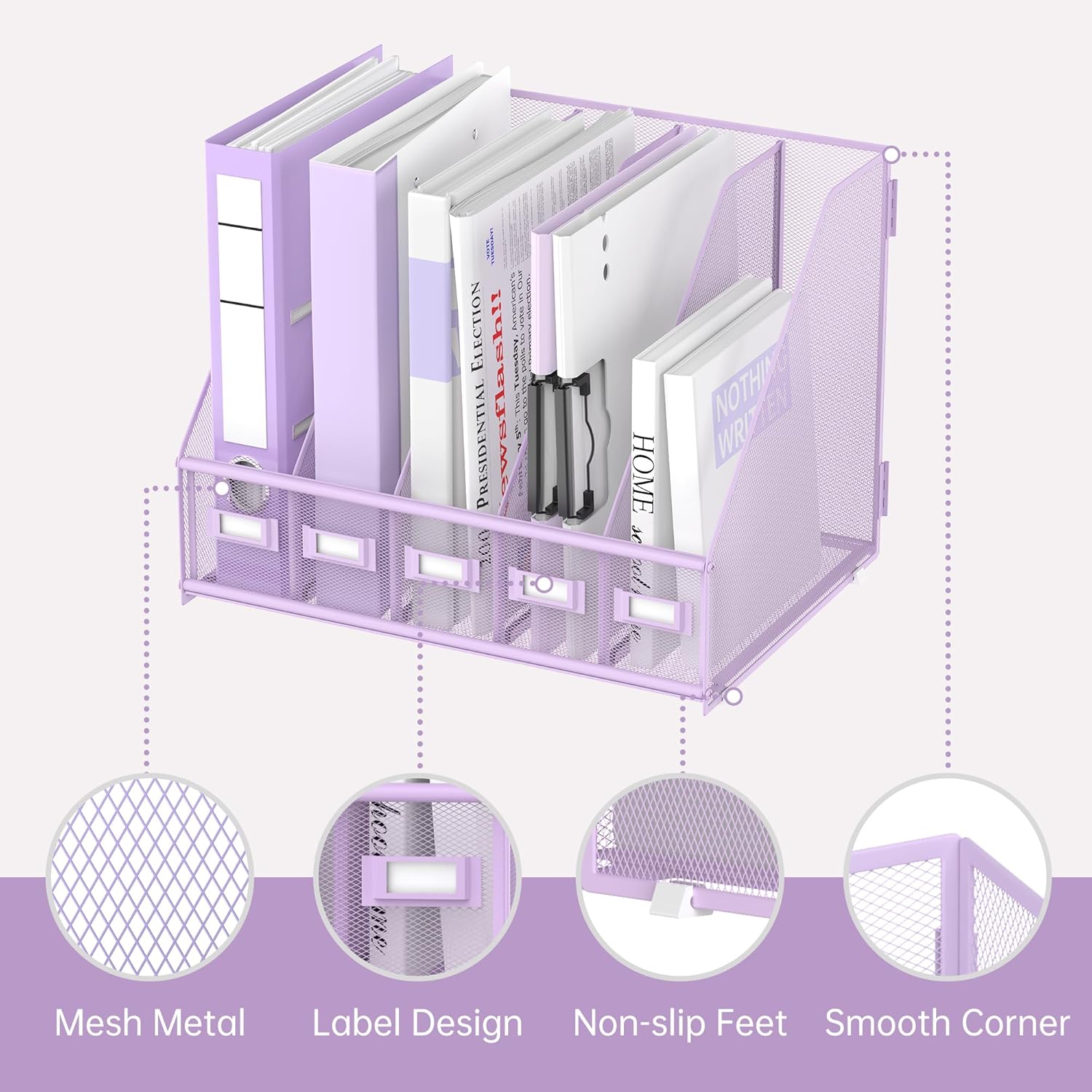 SUPEASY Desk Organizers Metal Desk Magazine File Holder with 5 Vertical Compartments Rack File Organizer for Office Desktop, Home Workspace, Purple Plus