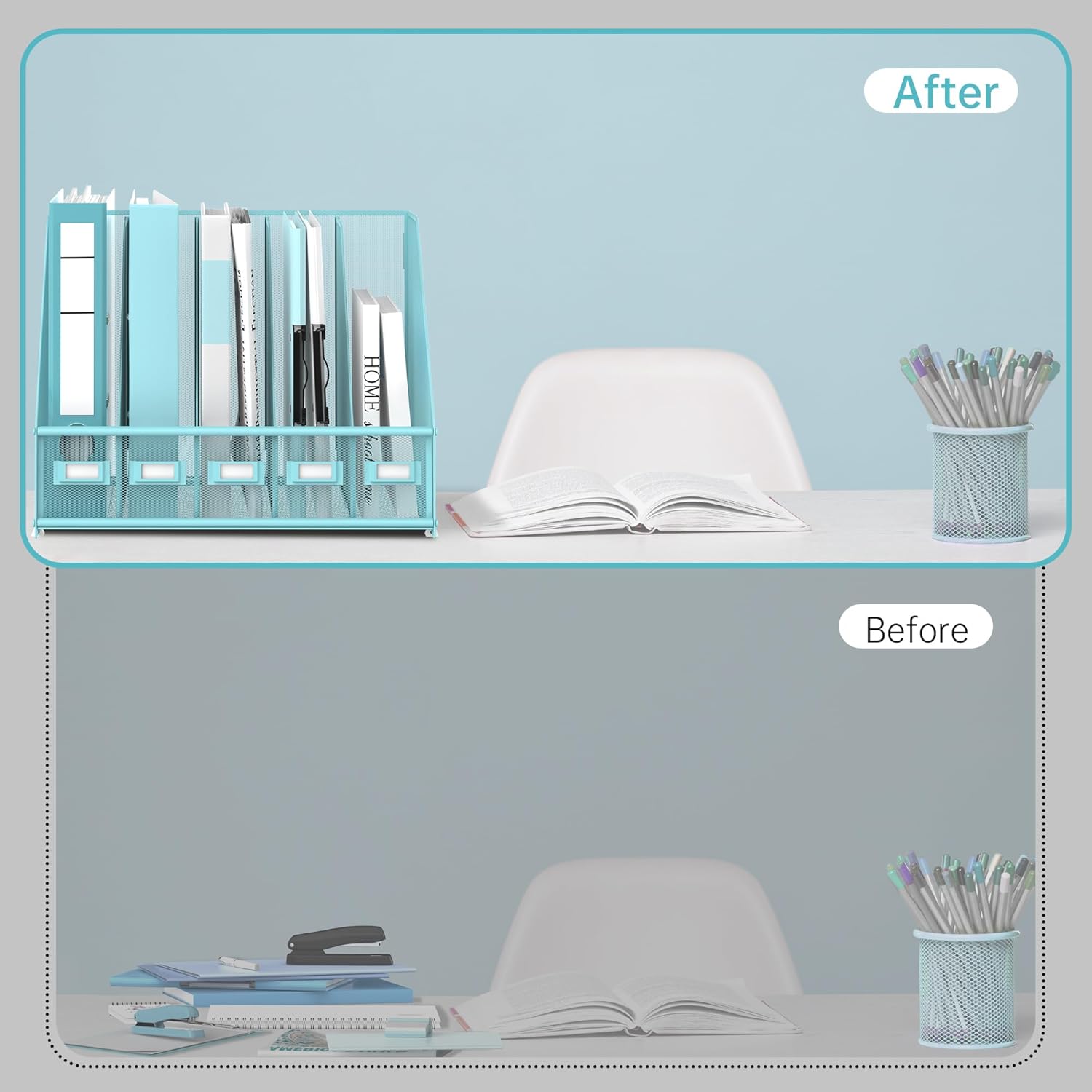 SUPEASY Desk Organizers Metal Desk Magazine File Holder with 5 Vertical Compartments Rack File Organizer for Office Desktop, Home Workspace, Blue Plus