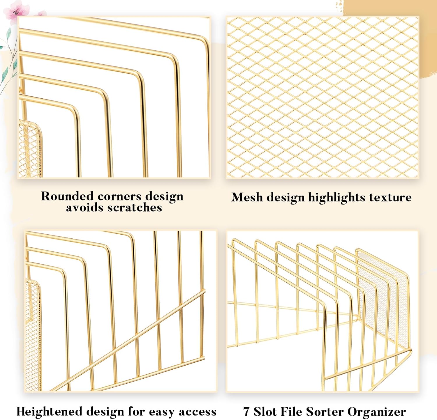 2 Pcs 7 Slot Incline File Sorter Metal Wire Mesh File Racks for Desktop Letter Sorter for Magazine Folder Book Organizer Home Office School Paper Mail Desk Storage Holder(Golden)