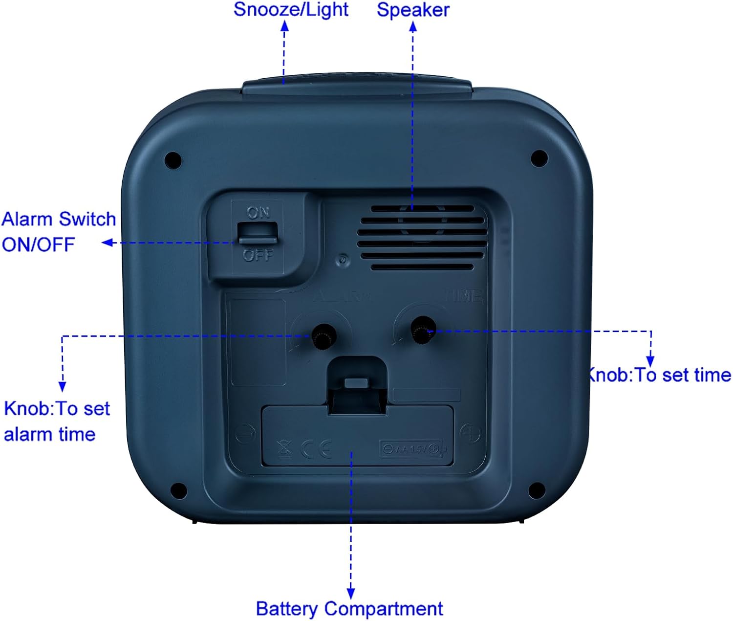 - Large Size-- Size: 5.5" x 5.5" x 2.2",runs on 1 "AA" Battery (not included). Alarm clock stands up at an angle, high quality plastic, square face with white dial, black Arabic numerals, good decoration for tabletop, desk & shelf, bedrooms. Also large size screen and clear bold digits to display time, perfect alarm clock for elderly.