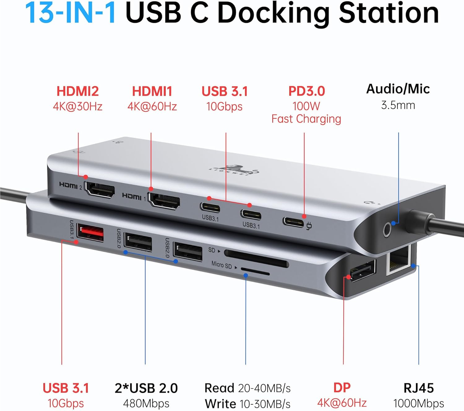 LIONWEI Laptop Docking Station 13 in 1 - Dual HDMI+DisplayPort+10Gbps, 6 USB C/A, 100W PD, Ethernet, SD/TF, Audio, USB C Hub for MacBook/Dell/HP/Surface