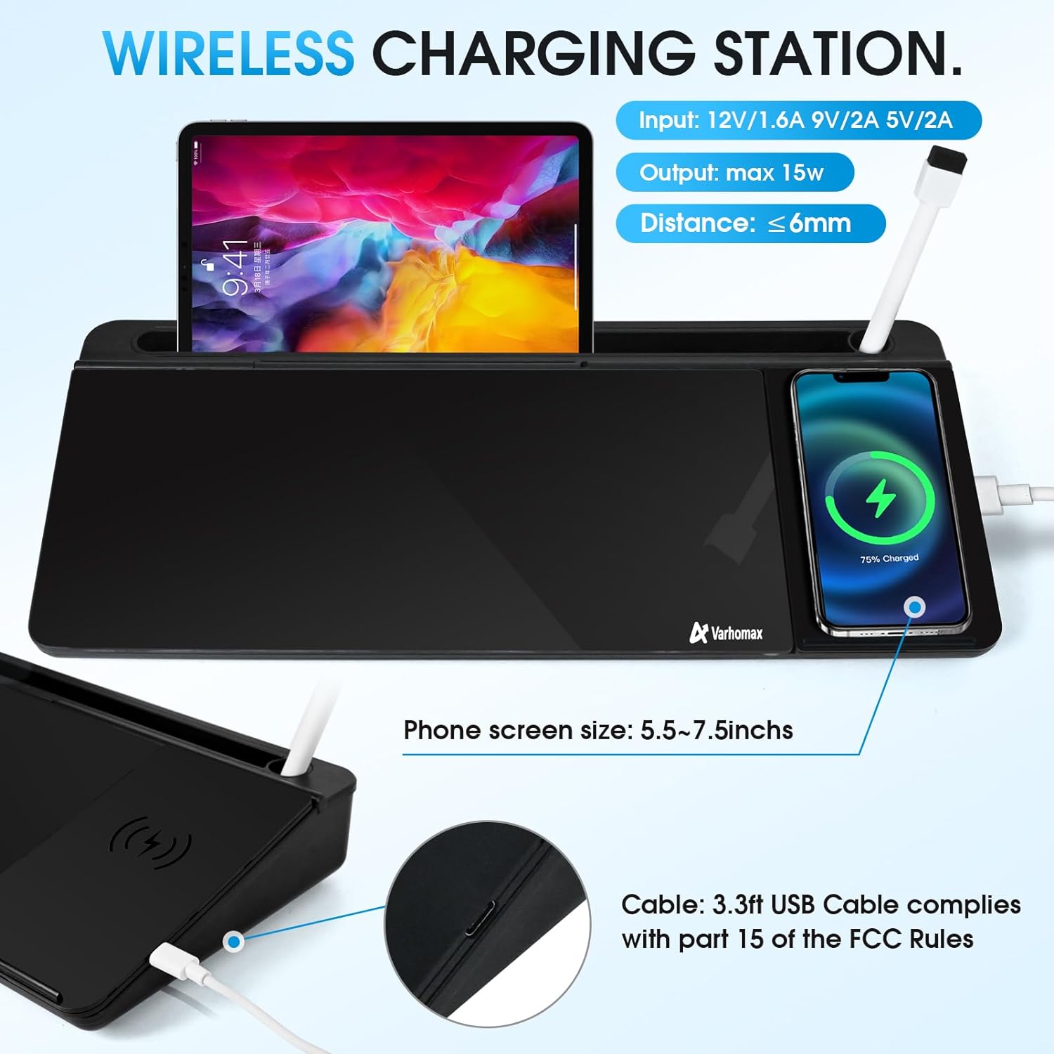 Varhomax Glass Desk Whiteboard Black with Wireless Charger, Desktop Dry Erase White Board with Storage,to Do List Memo Notepad for Home and Office