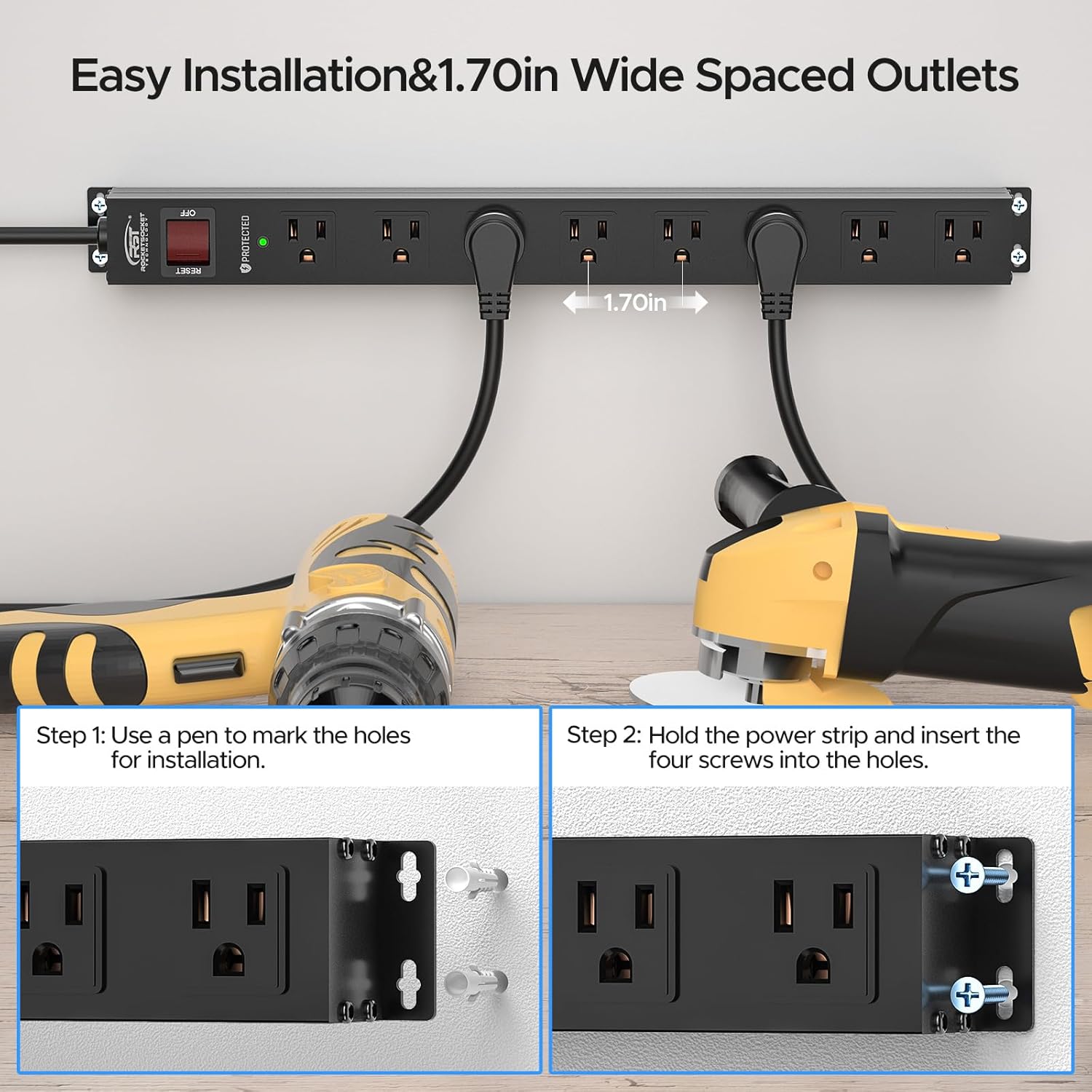 - [Humanized Design] This mountable power strip is designed to fit the standard 16-inch stud spacing, allowing you to easily attach it to your wall studs for a secure and organized setup. Wide-spaced 1.7-inch center-to-center outlet, perfect for bulky plugs and power supplies. 45° angled flat plug, and mounting supported hanging slots, all these features bring you more convenience.