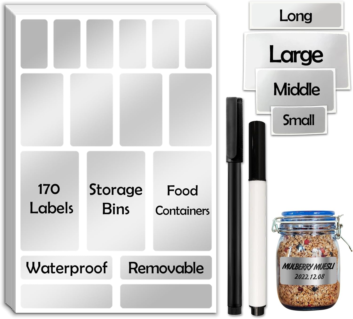 170Pcs Brightsilver Removable Labels for Jars,for Storage Bins,for Food Containers with 2 Liquid Chalk Marker(Brightsilver)