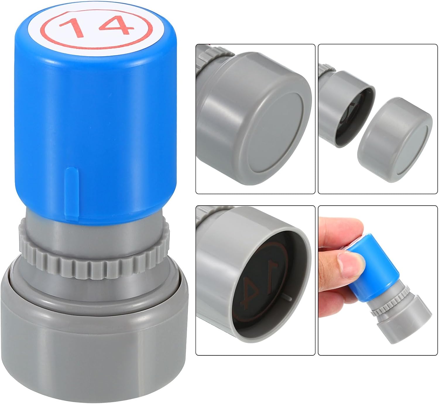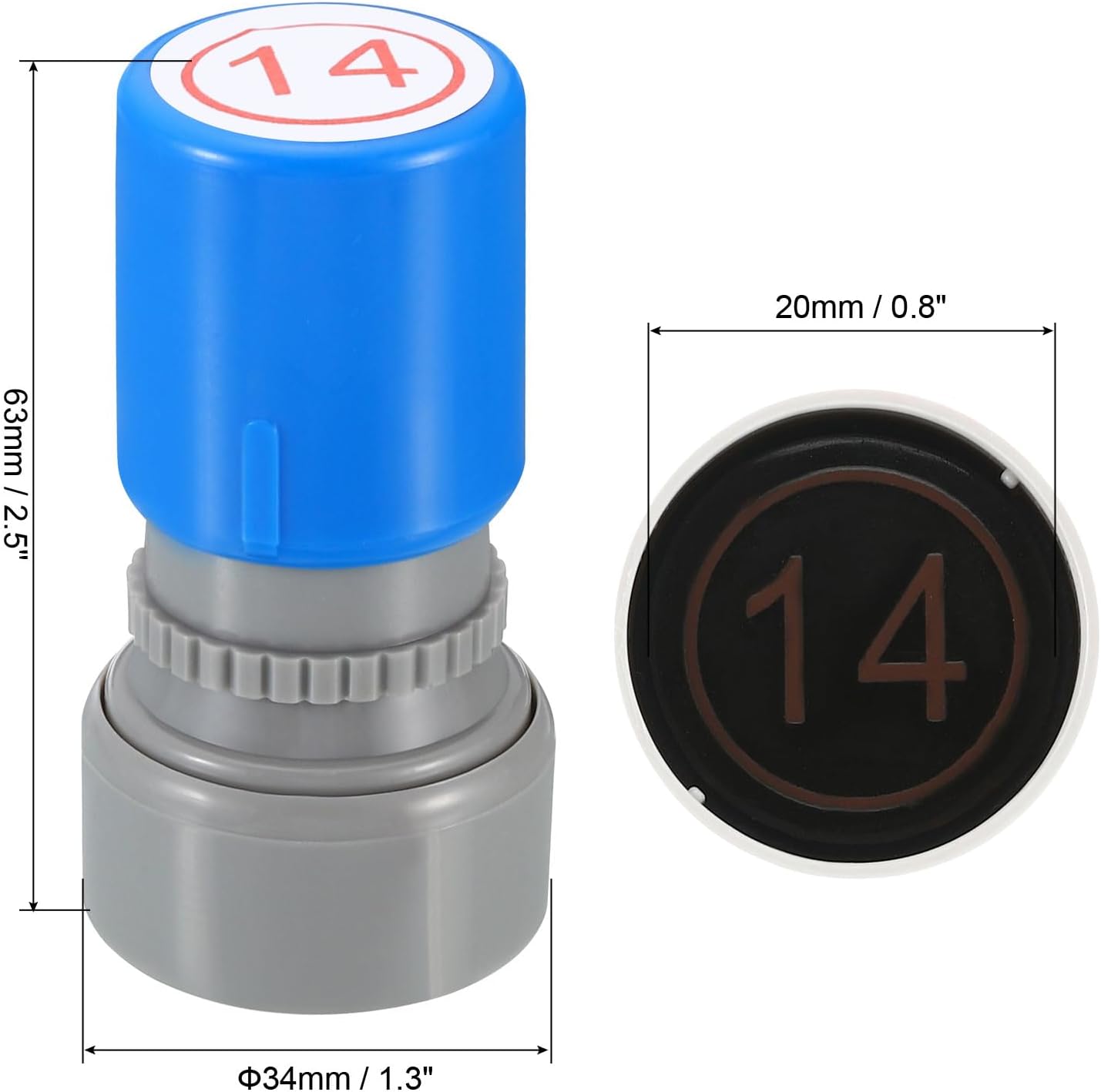 - Ink Color: Red; Shell Color: Blue; Pattern: Digital 14; Material: Plastic; Character Size: 20mm / 0.8 inch; Overall Size: 34 x 63mm / 1.3 x 2.5 inch(D*H); Packing List: 1 x Number Learning Stamp, 1 x Ink
