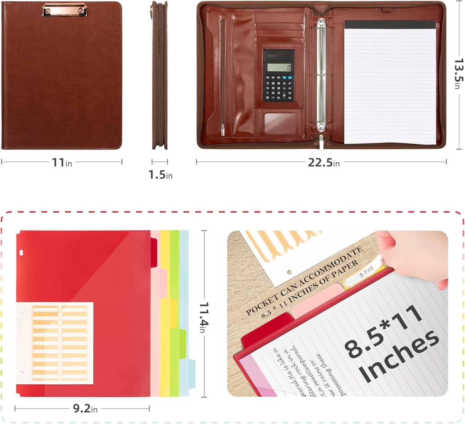 Ospelelf 3 Ring Binder Portfolio Folder with Zipper- Leather Padfolio with Clipboard Storage- Calculator, 12.1” Tablet Sleeve, 5 Dividers with Pocket, Refillable Notepad, Card Slot (Red Brown)
