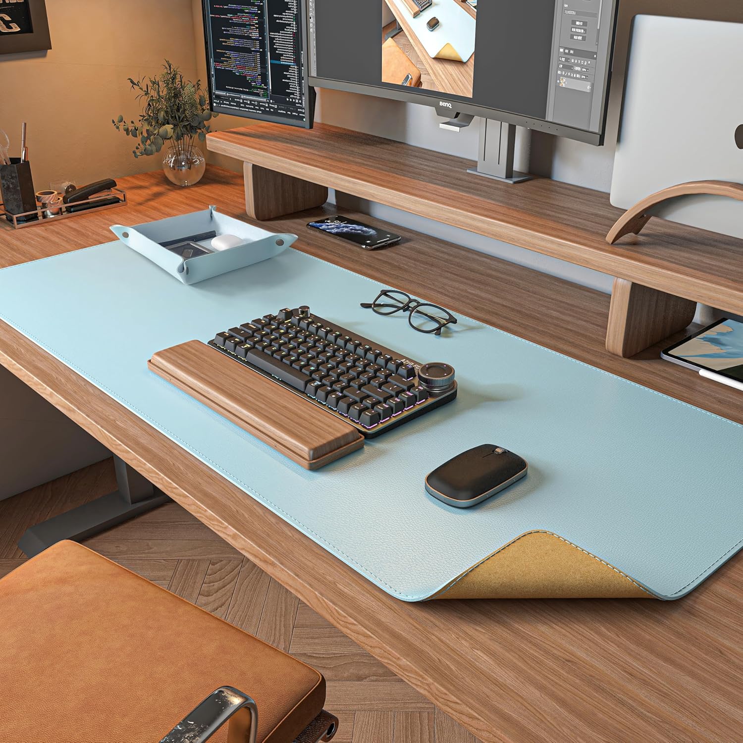DAWNTREES Dual Sided Desk Mat,Leather Desk Pad,Cork Desk Mat Protector,with PU Leather Valet Tray Organizer,Large Mouse Pad,Desk Writing Pad for Office and Home(Light Blue 31.5"x15.8")