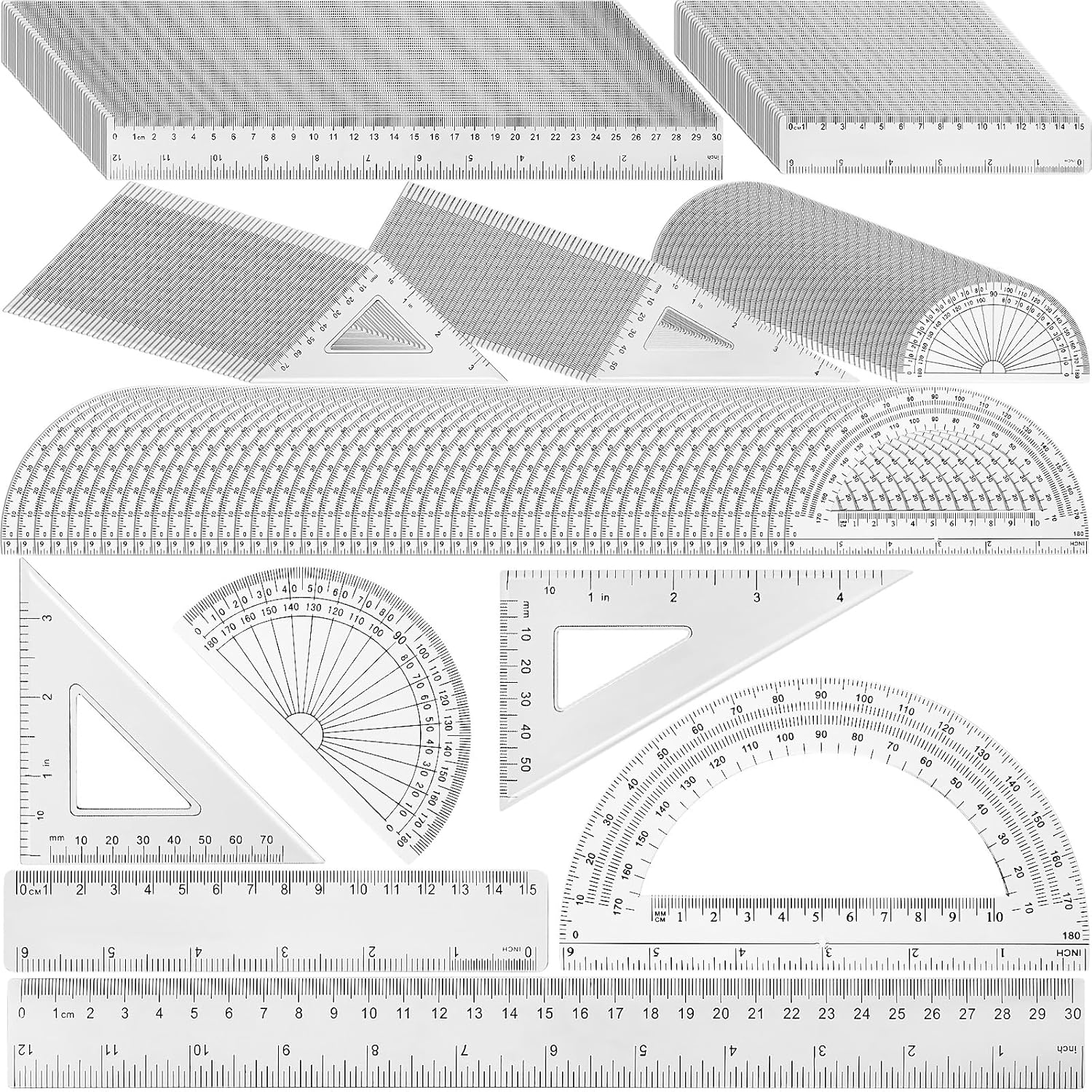 Tenare 288 Pcs Plastic Clear Math Set Includes Protractor Triangle Rulers 12 Inch 6 Inch Straight Geometry Math Transparent Ruler Measuring Tool for School Office Home Supplies