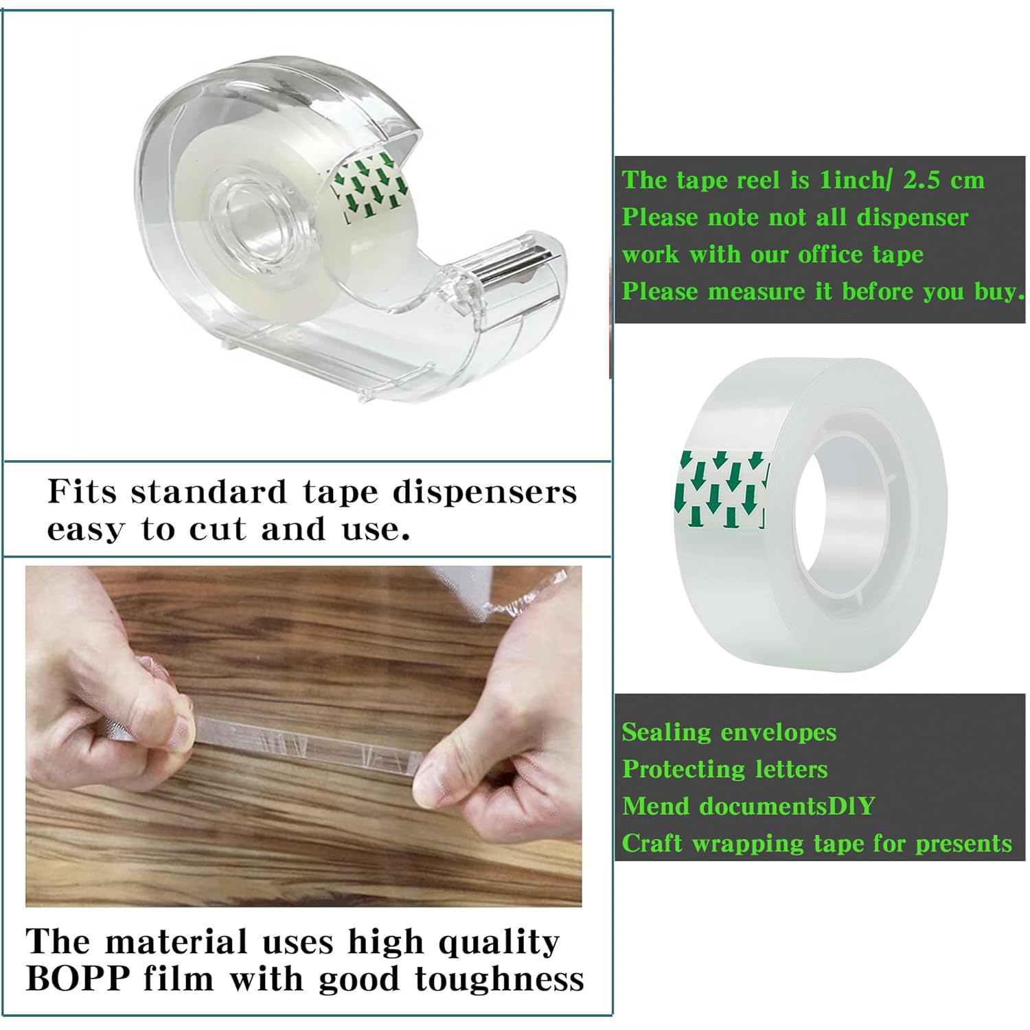- CLEAR TAPE: Multi pack Tape rolls bulk with transparent tape dispenser and clear tape with special adhesive technology for stronger adhesion, giving your products a stronger seal while safely, permanently and invisibly repairing tears and breaks