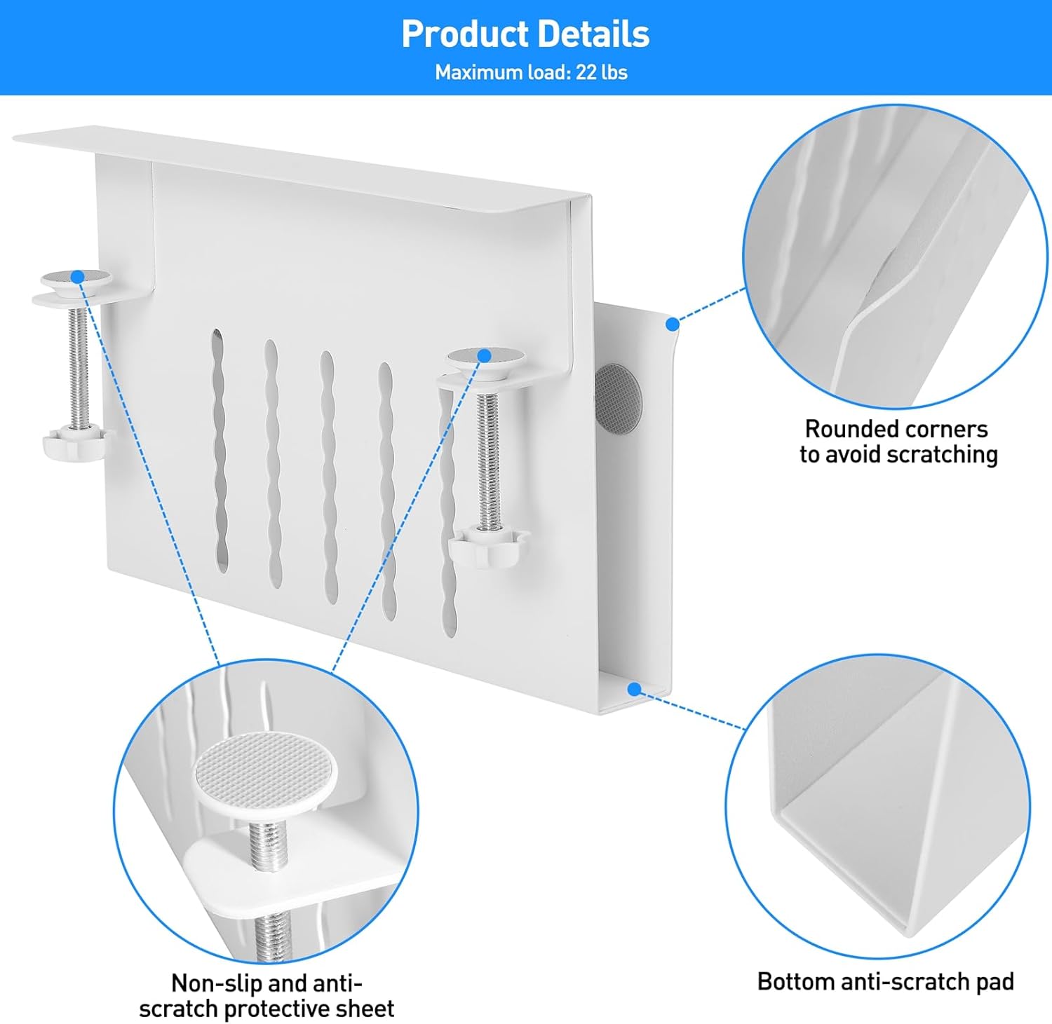 - 【Non-Slip & Anti-Scratch Sheets】On the inner surface and the bottom of our laptop tray and both ends of the clamp feature non-slip sheets, which can help fix the laptop on the desk side storage without scratching the laptop, tablet or other device.