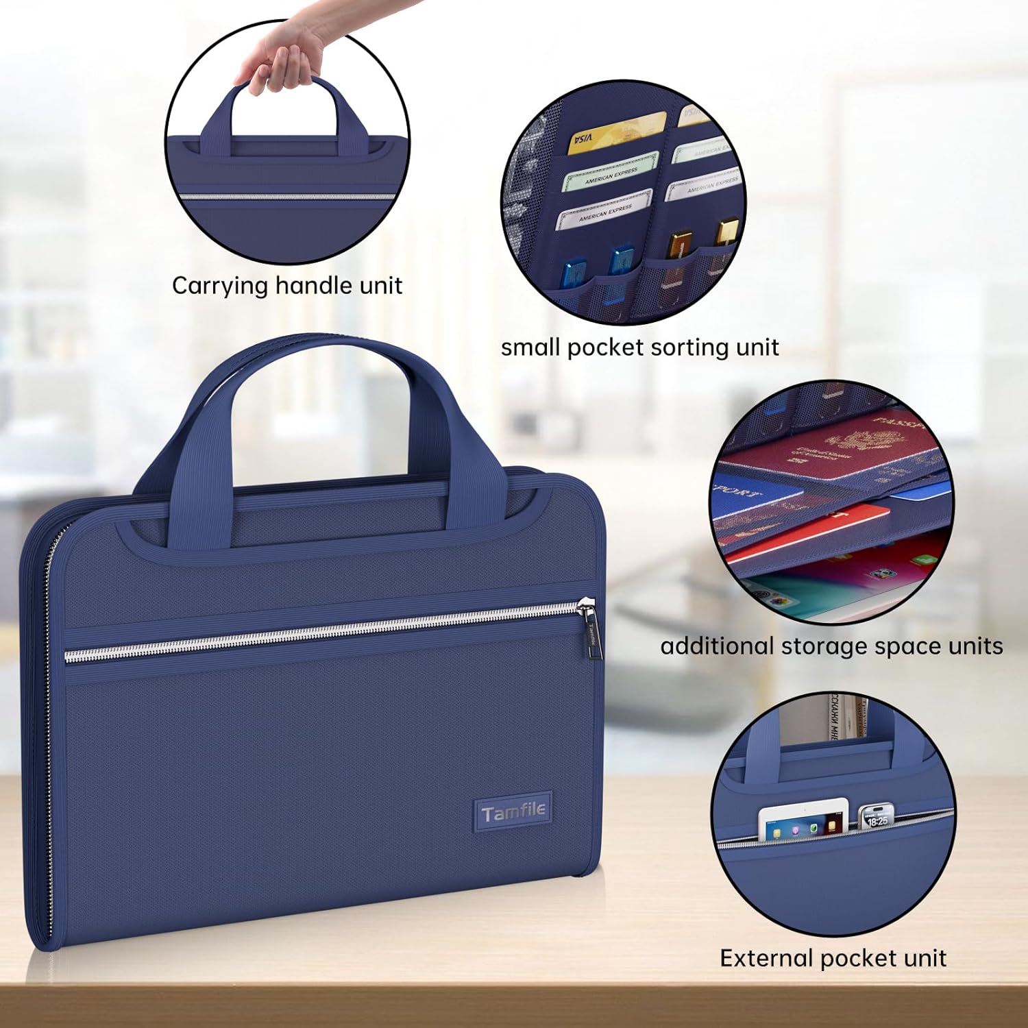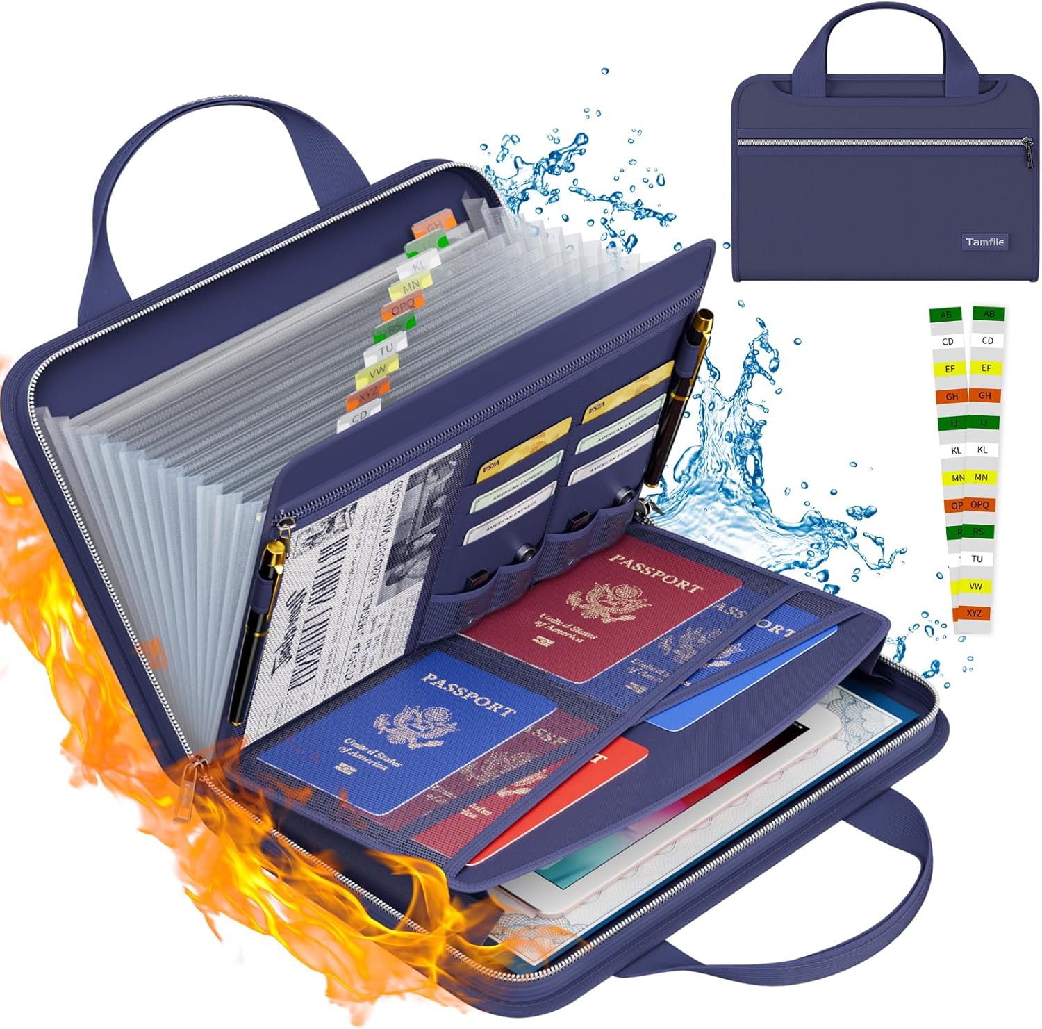 Tamfile Fireproof Accordion File Organizer with Handle, 13 Pocket Expanding File Folder with Zipper & Labels, File Folder with Multi-Pockets Paper Organizer Folder for Letter A4 Files, Blue