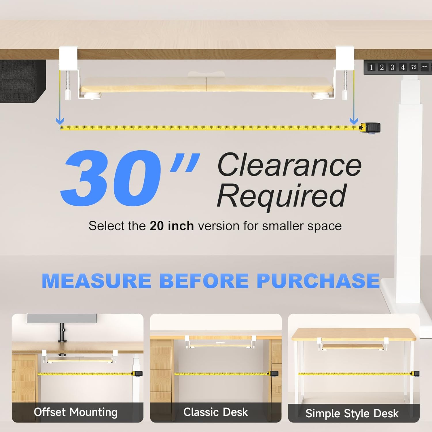 - Universal - This 25.6" (30" including clamps) x 11.8" under-desk keyboard tray holds your keyboard, mouse, and other small accessories below the desktop to add work space. Please not it does NOT fit if your desk thickness is over 1.57”.