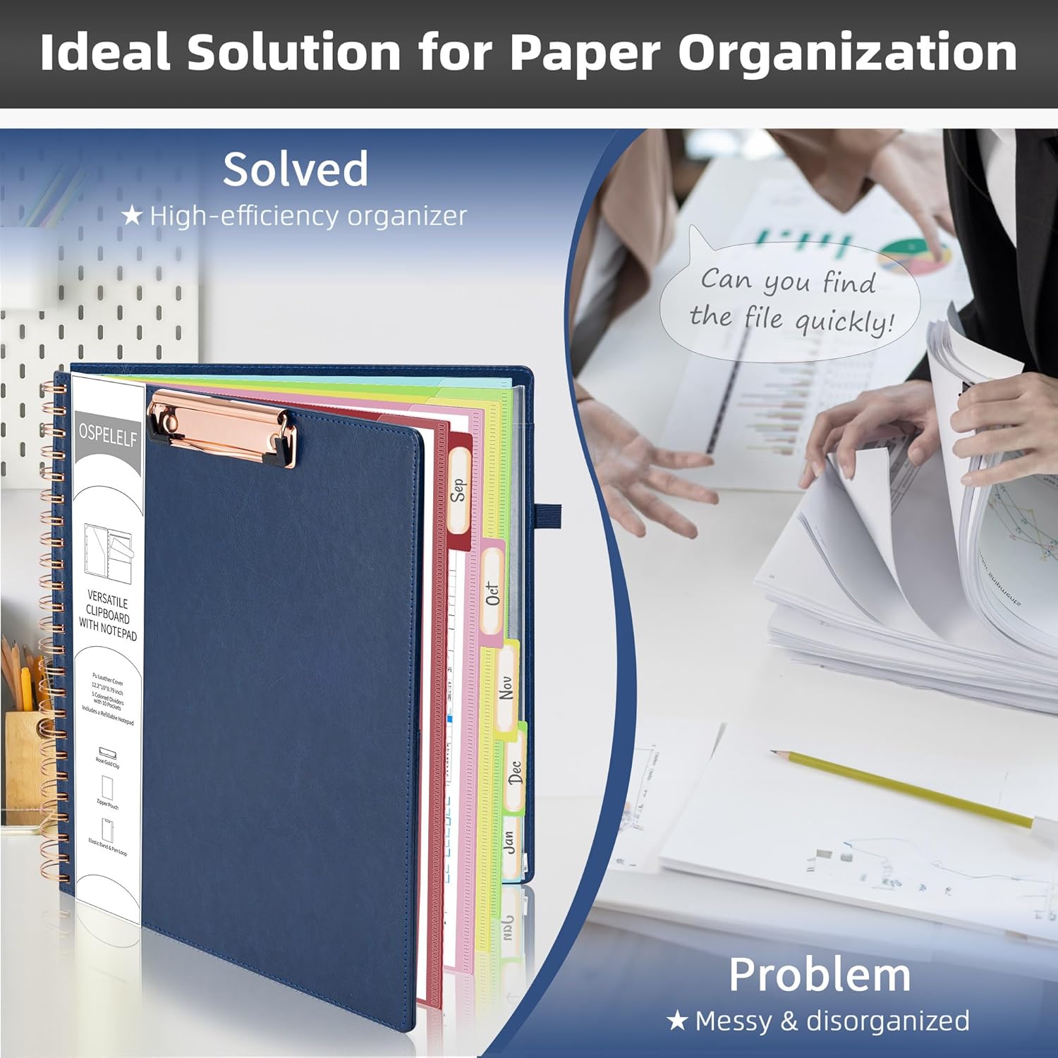 Ospelelf Leather Clipboard Folio with Notepad for Letter Size, Spiral Clipboard Folder with Storage Zipper Pouch, 5 Folders with 10 Pockets, 39 Divider Label Stickers, Pen Loop Series (Blue)