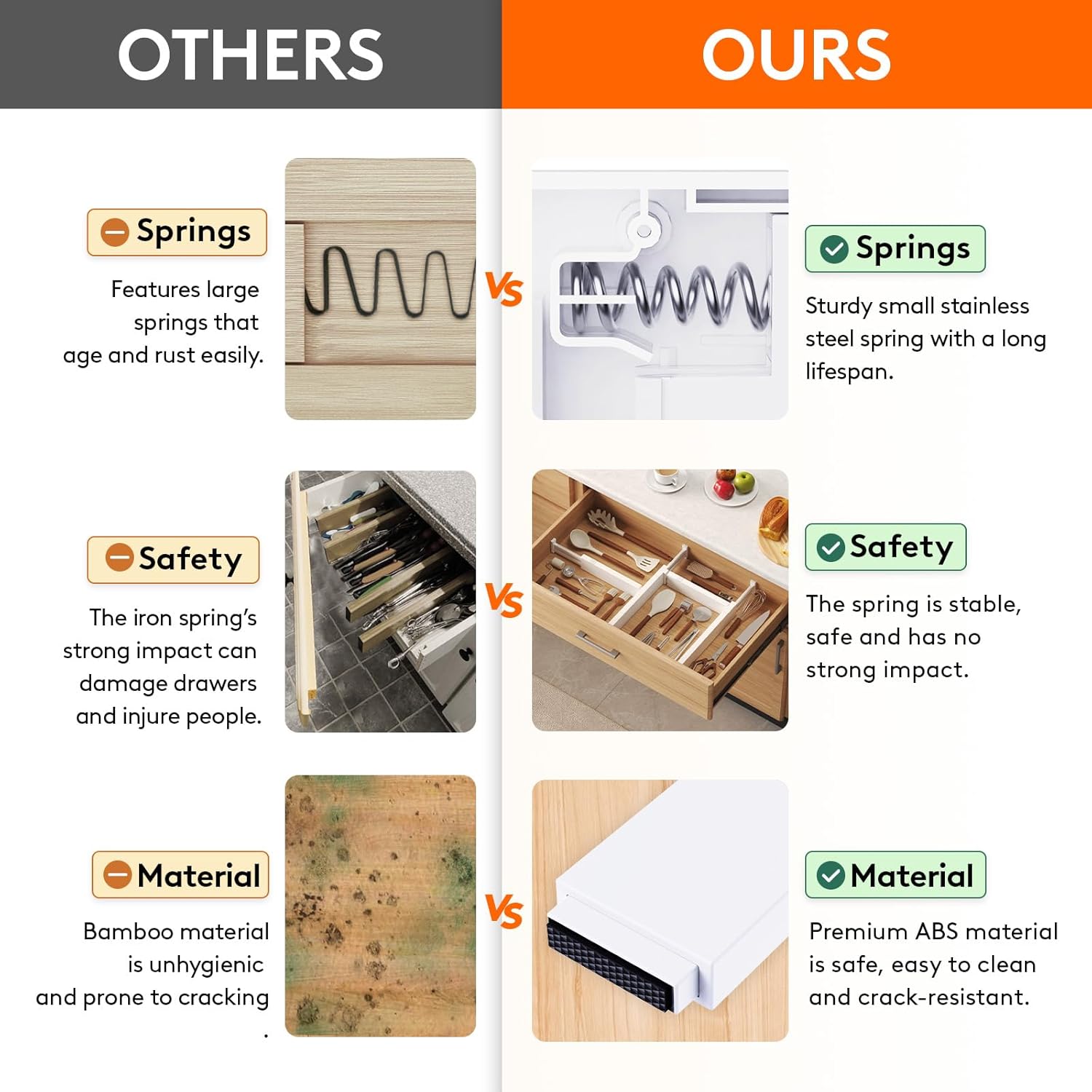 - Advanced Design: Our kitchen drawer organizer is made from stable ABS material and has high-quality EVA foam sponges at the ends to prevent scratches and damage to drawer walls, leaving no trace or residue. Additionally, our divider is patented (Patent No: US12133593B2) for a unique experience.