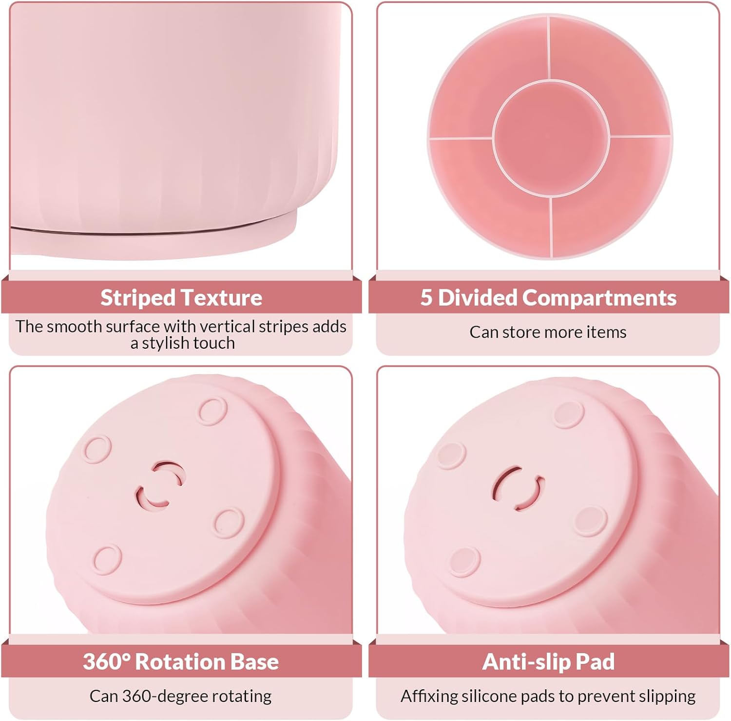 - Space-Saving: The design of 5 compartments can be reasonably divided into storage areas. This 4.8*3.2 inch desk organizer can be placed anywhere in the office, vanity, bathroom, bedroom, and living room