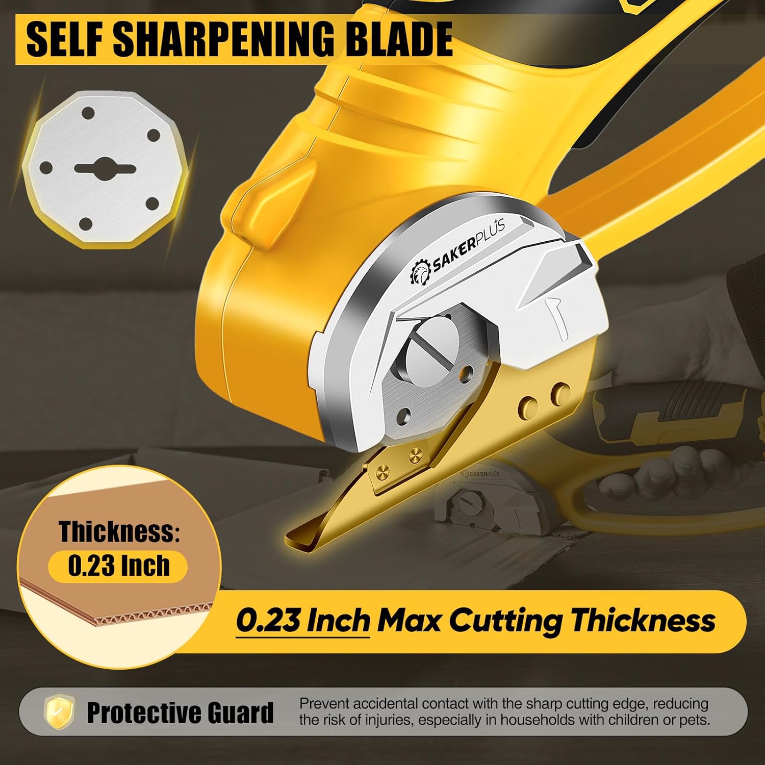 - 【SAFE & EASY CONTROL FOR EVERYDAY CUTTING】SakerPlus cordless cardboard cutter is designed with your safety in mind. To activate, press the safety button first, then the trigger - ensuring controlled, intentional use. The blade is covered by a secure metal shield with a small cutting gap, reducing the risk of injury. An integrated LED light improves visibility in low-light areas like garages, craft rooms, or warehouses.