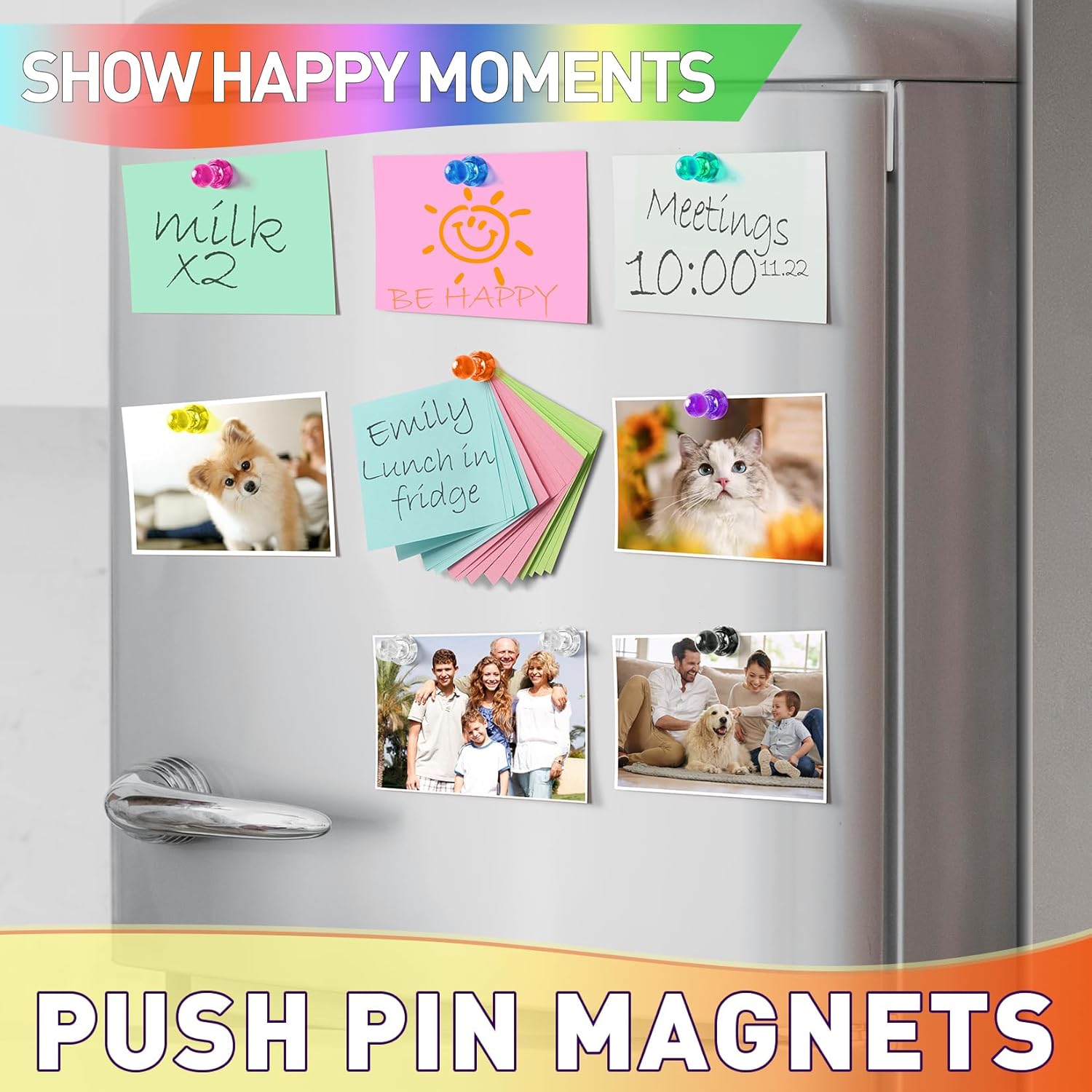 - 【Must-Have Items】 These colorful magnetic push pins are ideal for decorating refrigerators, whiteboards, bulletin board, file cabinets, lockers, magnetic maps and more with various items like family photo, pictures, notes teaching cards, and arts painting. Suitable for classrooms, kitchens, homes and offices.