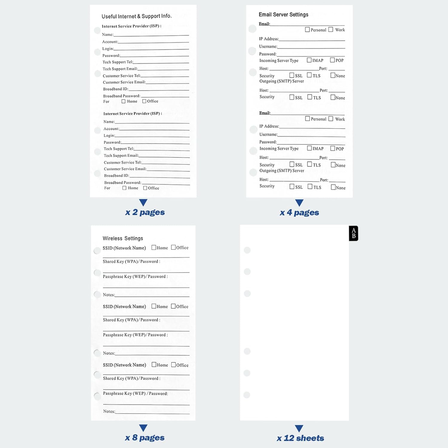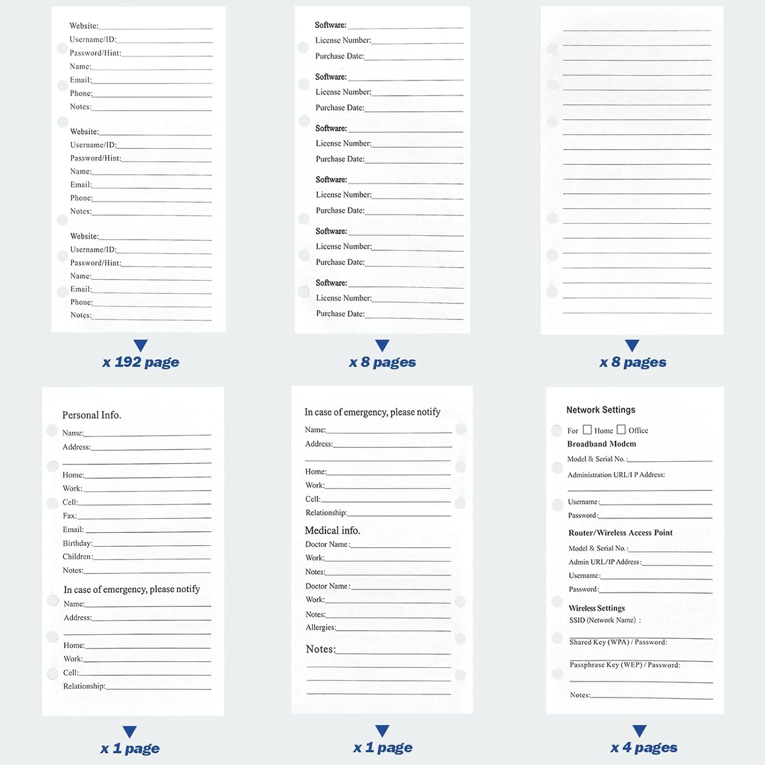 - Keep your important internet passwords, website, username/ID, name, phone, email,notes. license purchasing date, email settings, network settings, wireless settings and internet support info. personal info, emergency contacts with this pack of refill pages for perfect internet password keeper,huge space to store all your passwords and account & website login details in one place ,fully protect your online website account information & user data safe.