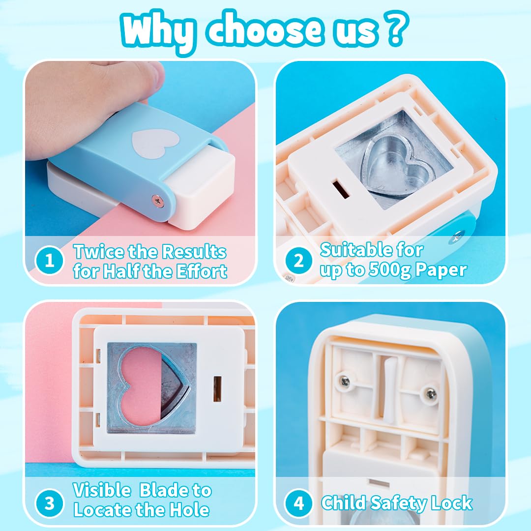 - UPGRADED HEART PUNCH : Designed for easier punching and perfect paper heart, our heart hole punch can punch out more beautiful 1 inch heart with a bigger handle, visible blade and child safety lock